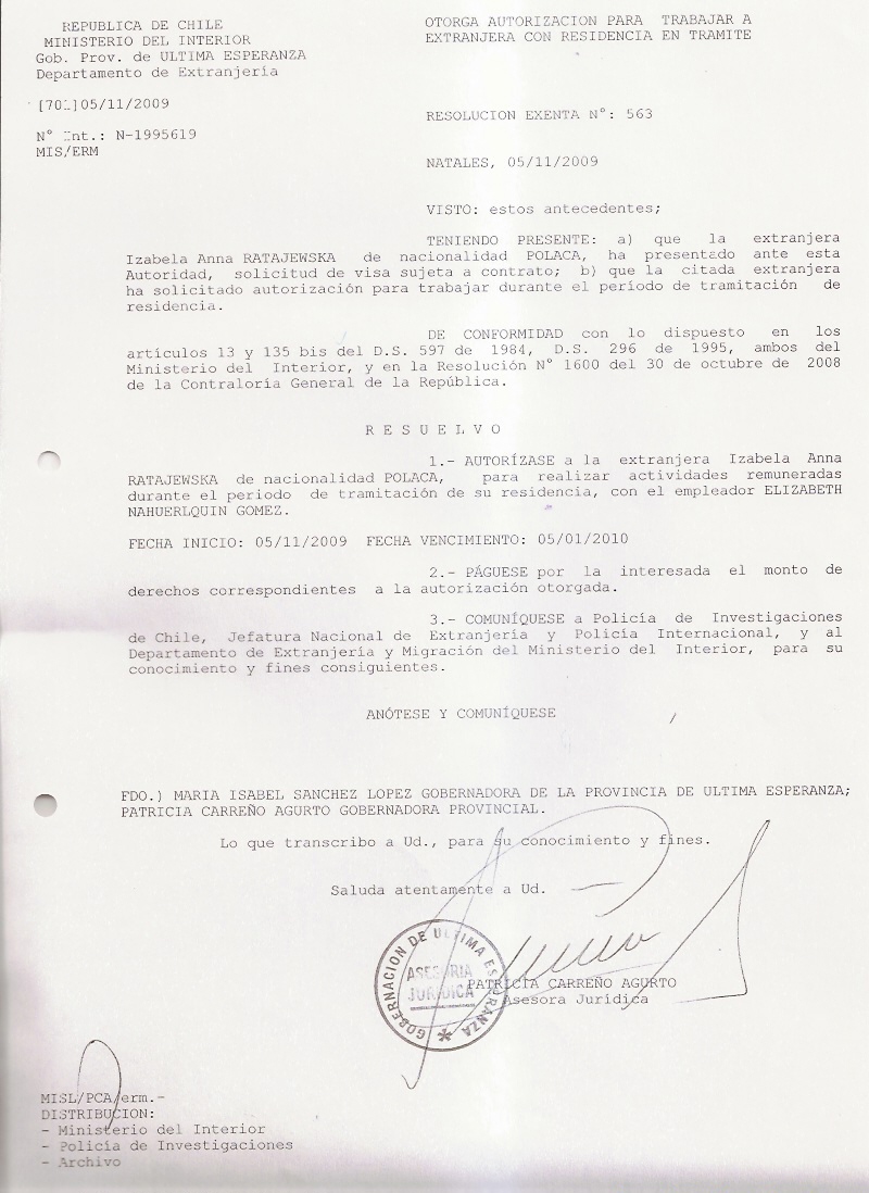 2 RESOLUCION EXENTA  563  AUTORIZACION PARA TRABAJAR CON VISSA EN TRAMITE A CIUDADANAN DE NACIONALIDAD POLACA, ISABELLA RATAJEWSKA  05/11/2009 Ver enlace