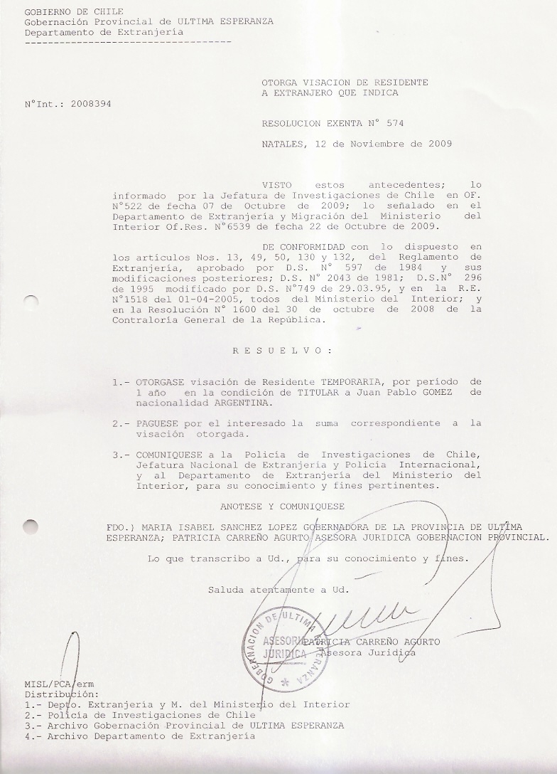 13 RESOLUCION EXENTA  584  OTORGAMIENTO DE VISA DE RESIDENCIA A CIUDADANA DE NACIONALIDAD ARGENTINA, JUAN PABLO GOMEZ  12/11/2009 Ver enlace