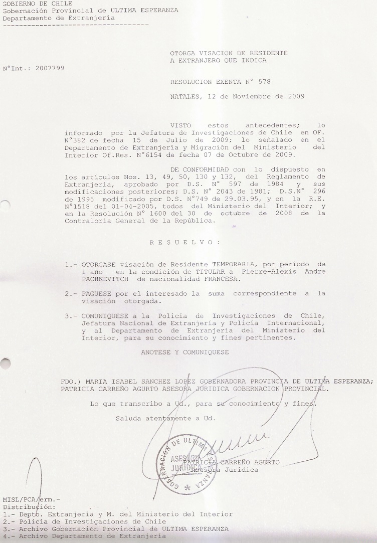 10 RESOLUCION EXENTA  579  OTORGAMIENTO DE VISA DE RESIDENCIA A CIUDADANA DE NACIONALIDAD FRANCESA, PIERRE ALEXIS ANDRE PACHKEVITCH  12/11/2009 Ver enlace