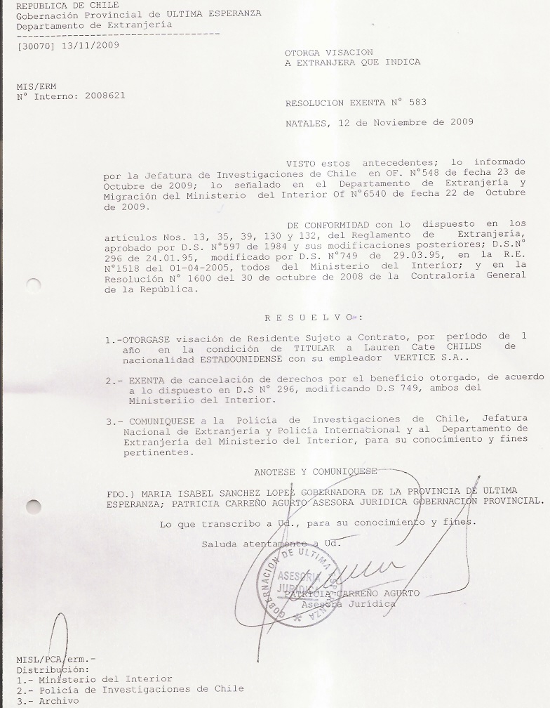 12 RESOLUCION EXENTA  583  OTORGAMIENTO DE VISA DE RESIDENCIA A CIUDADANA DE NACIONALIDAD ESTADOUNIDENSE, LAUREN CATE CHILDS  12/11/2009 Ver enlace