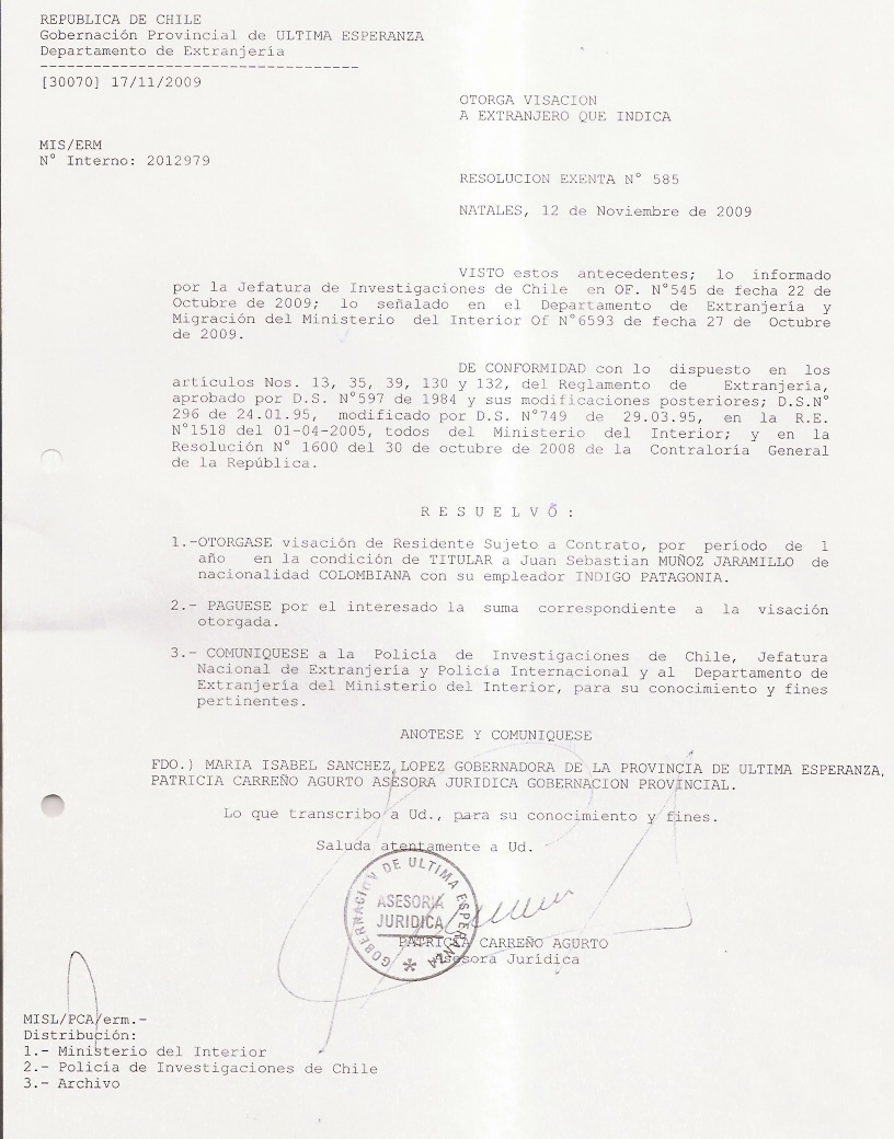 14 RESOLUCION EXENTA  585  OTORGAMIENTO DE VISA DE RESIDENCIA A CIUDADANA DE NACIONALIDAD COLOMBIANA, JUAN SEBASTIAN MUÑOZ JARAMILLO  12/11/2009 Ver enlace