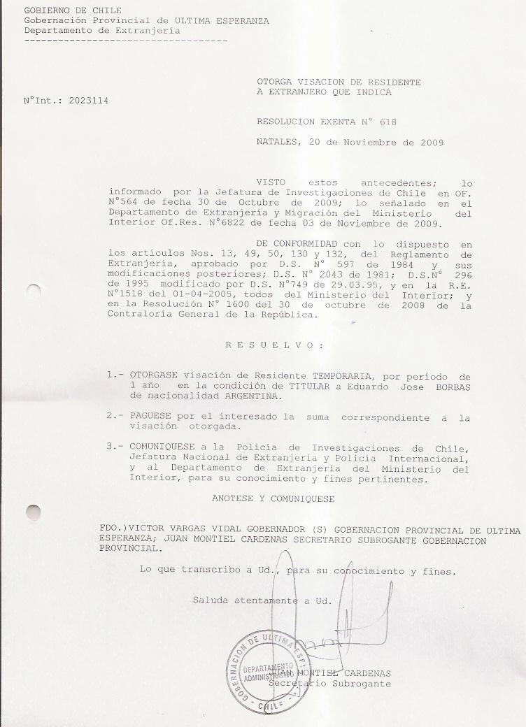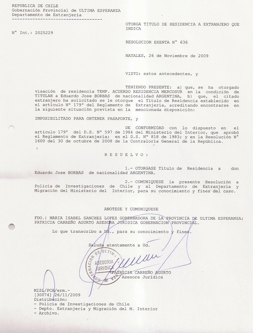 26 RESOLUCION EXENTA  636  TITULO DE RESIDENCIA A CIUDADANANO DE NACIONALIDAD ARGENTINA, EDUARDO JOSE BORBAS  26/11/2009 Ver enlace