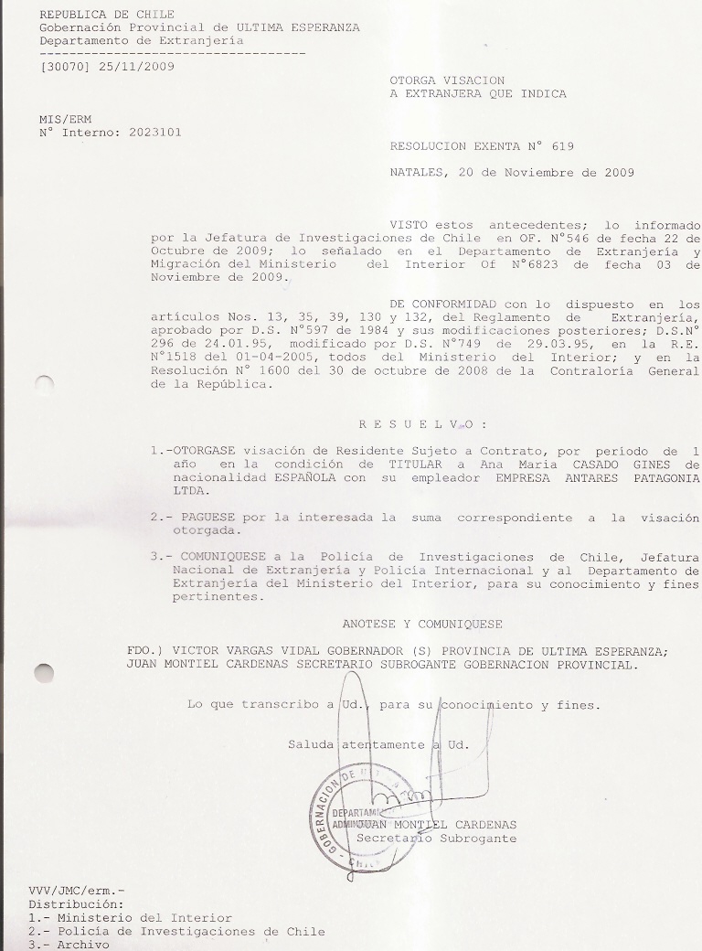 22 RESOLUCION EXENTA  619  OTORGAMIENTO DE VISA A CIUDADANO DE NACIONALIDAD ESPAÑOLA, ANA MARIA CASADO GINES  20/11/2009 Ver enlace