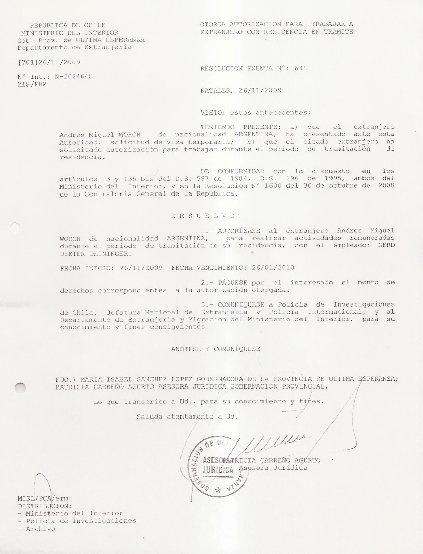 28 RESOLUCION EXENTA  638  AUTORIZACION PARA TRABAJAR CON VISA EN TRAMITE A CIUDADANO DE NACIONALIDAD ARGENTINA, ANDRES MIGUEL WORCH  26/11/2009 Ver enlace