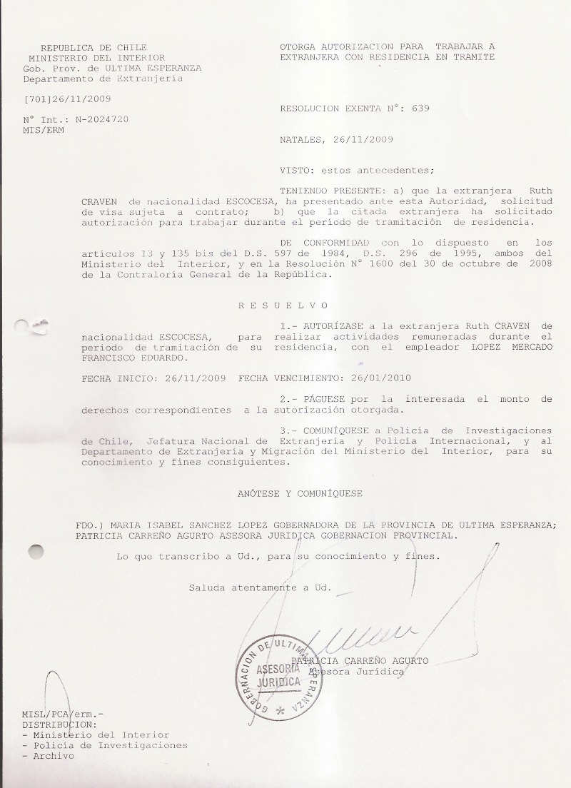 29 RESOLUCION EXENTA  639  AUTORIZACION PARA TRABAJAR CON VISA EN TRAMITE A CIUDADANA DE NACIONALIDAD ESCOSESA, RUTH CRAVEN  26/11/2009 Ver enlace