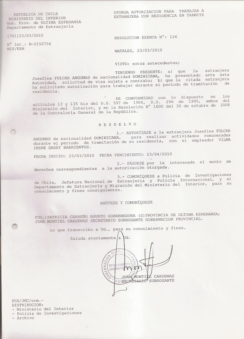 AUTORIZACION PARA TRABAJAR CON VISA EN TRAMITE A LA EXTRANJERA DE NACIONALIDAD REPUBLICA DOMINICANA DOÑA JOSEFINA FULCAR ANGOMAS.- |