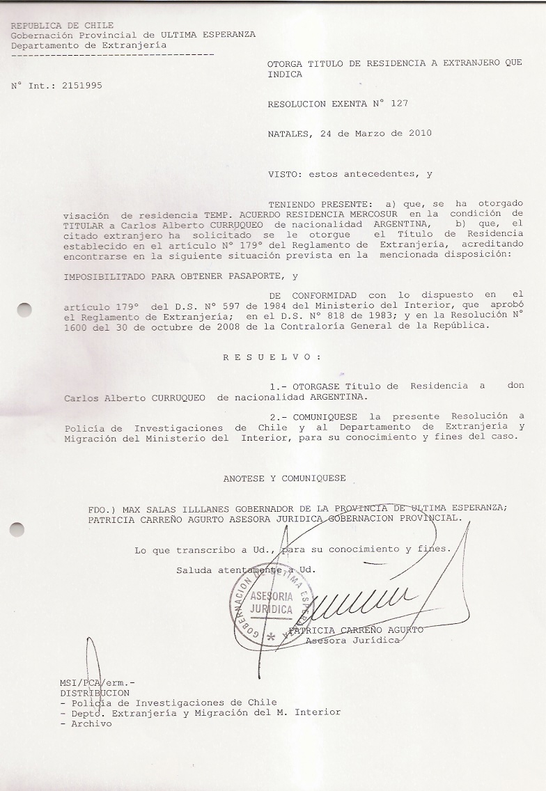 OTORGAMIENTO DE TITULO DE RESIDENCIA A CIUDADANO DE NACIONALIDAD ARGENTINA, CARLOS ALBERTO CARRUQUEO |