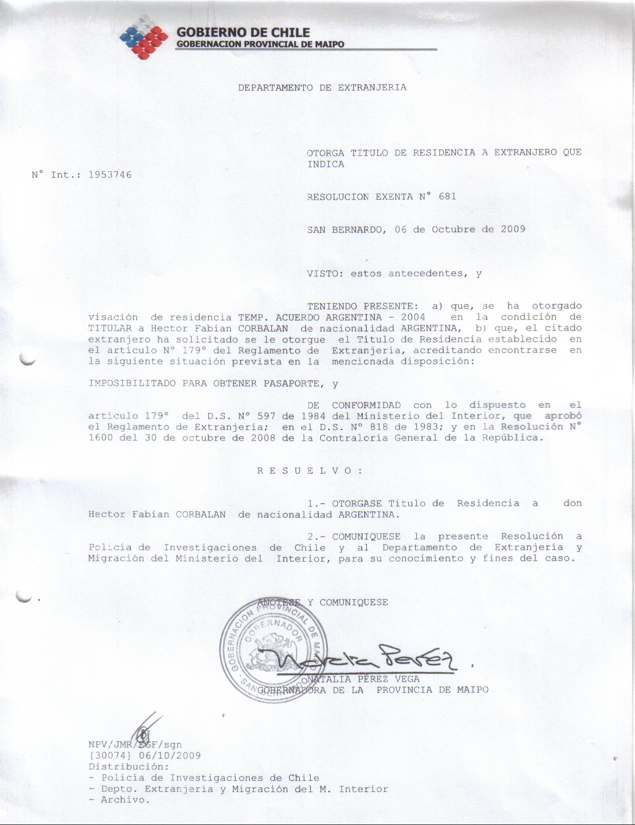 OTORGA TITULO DE RESIDENCIA HECTOR FABIAN CORBALAN |