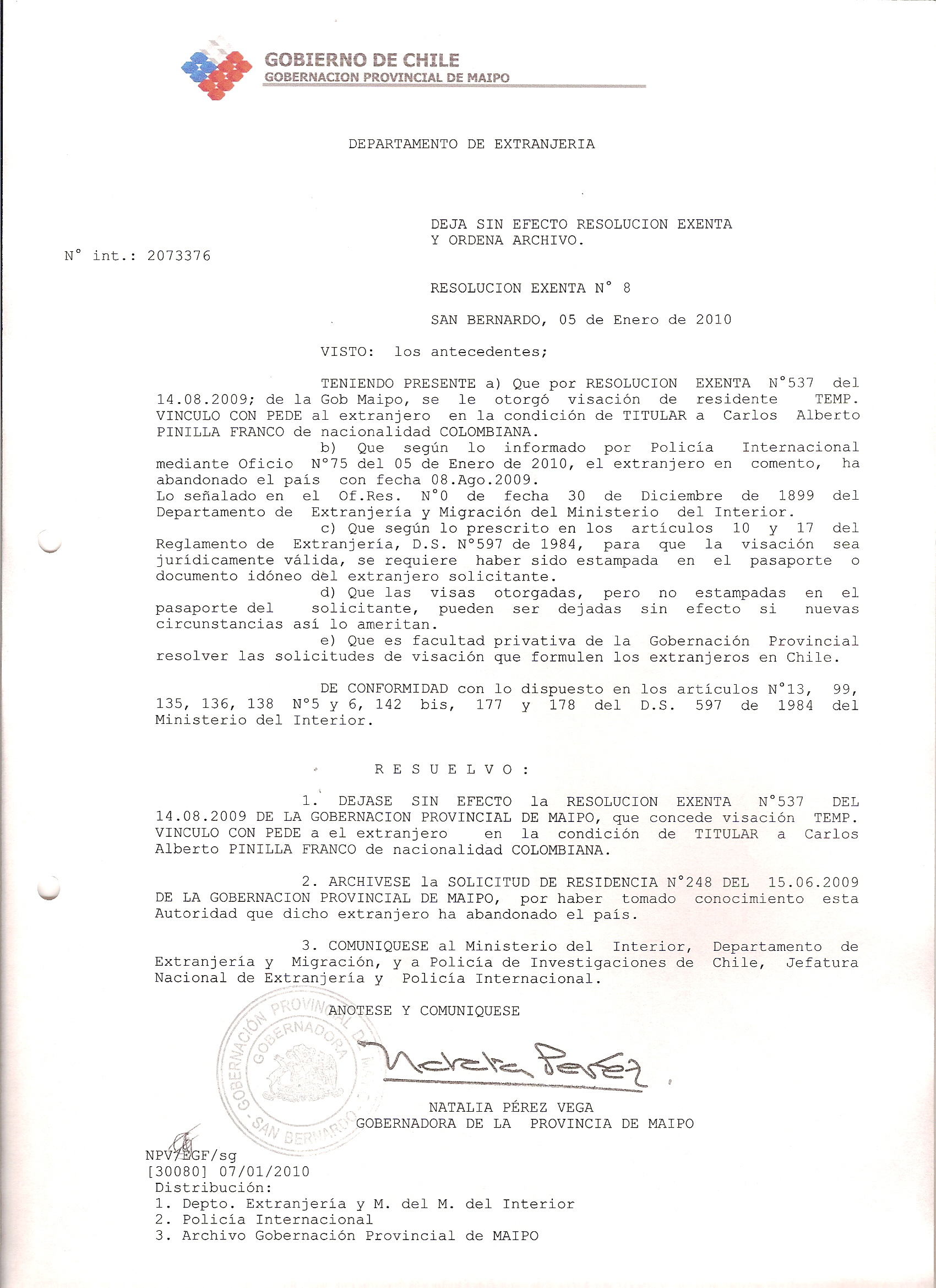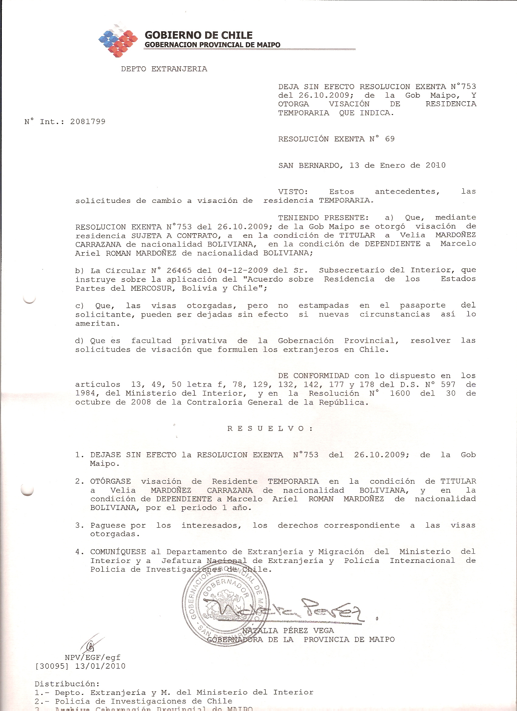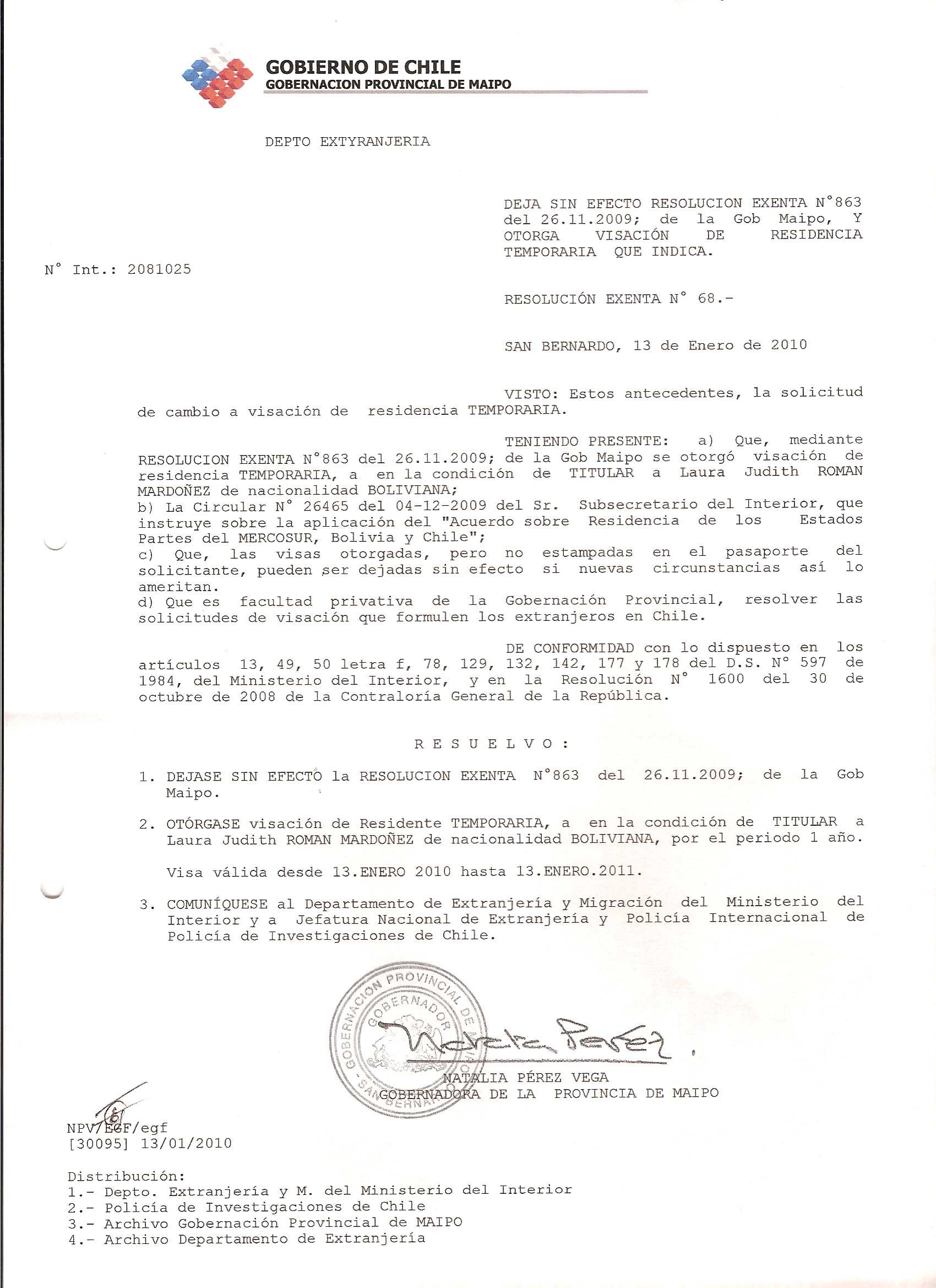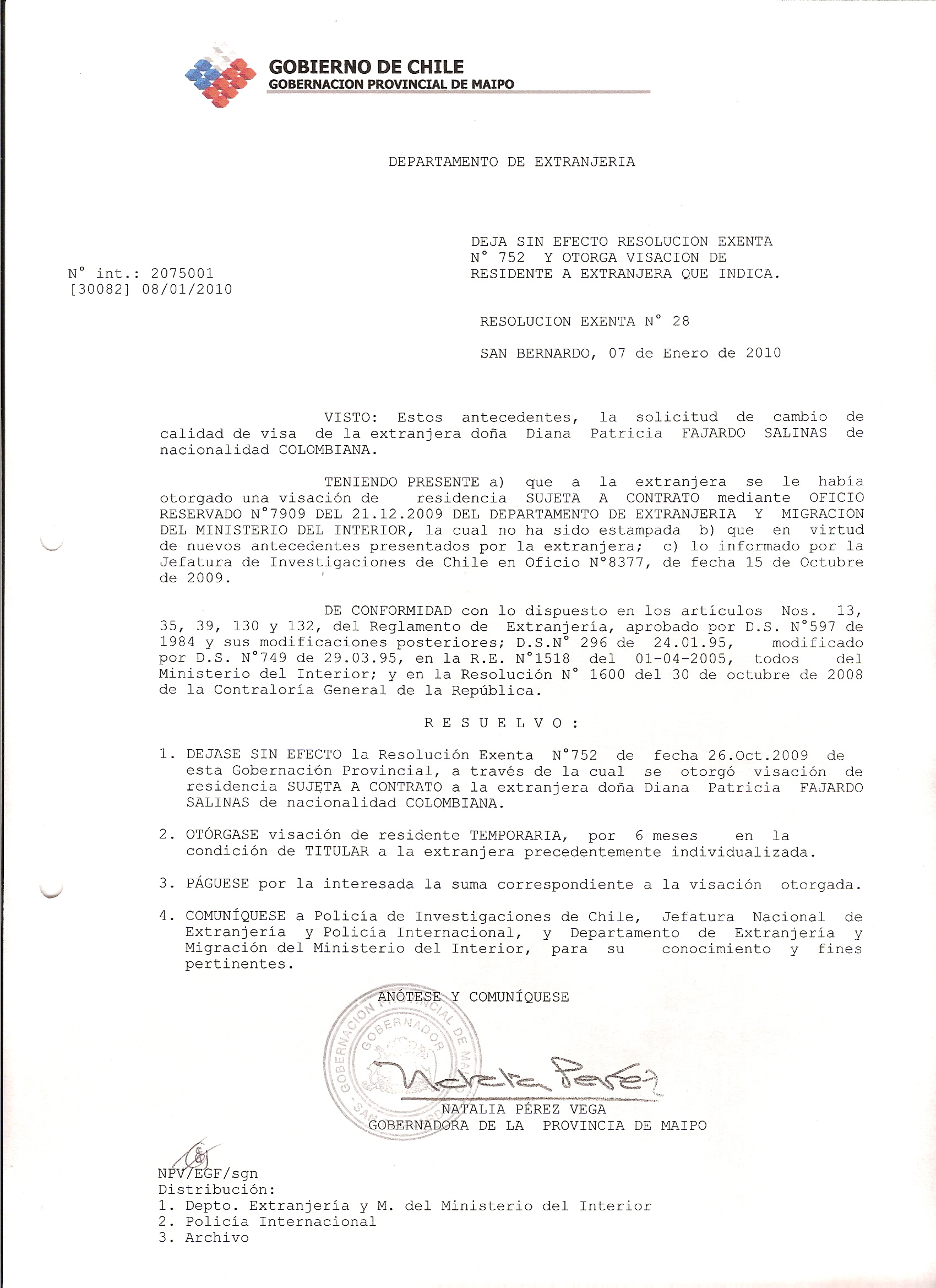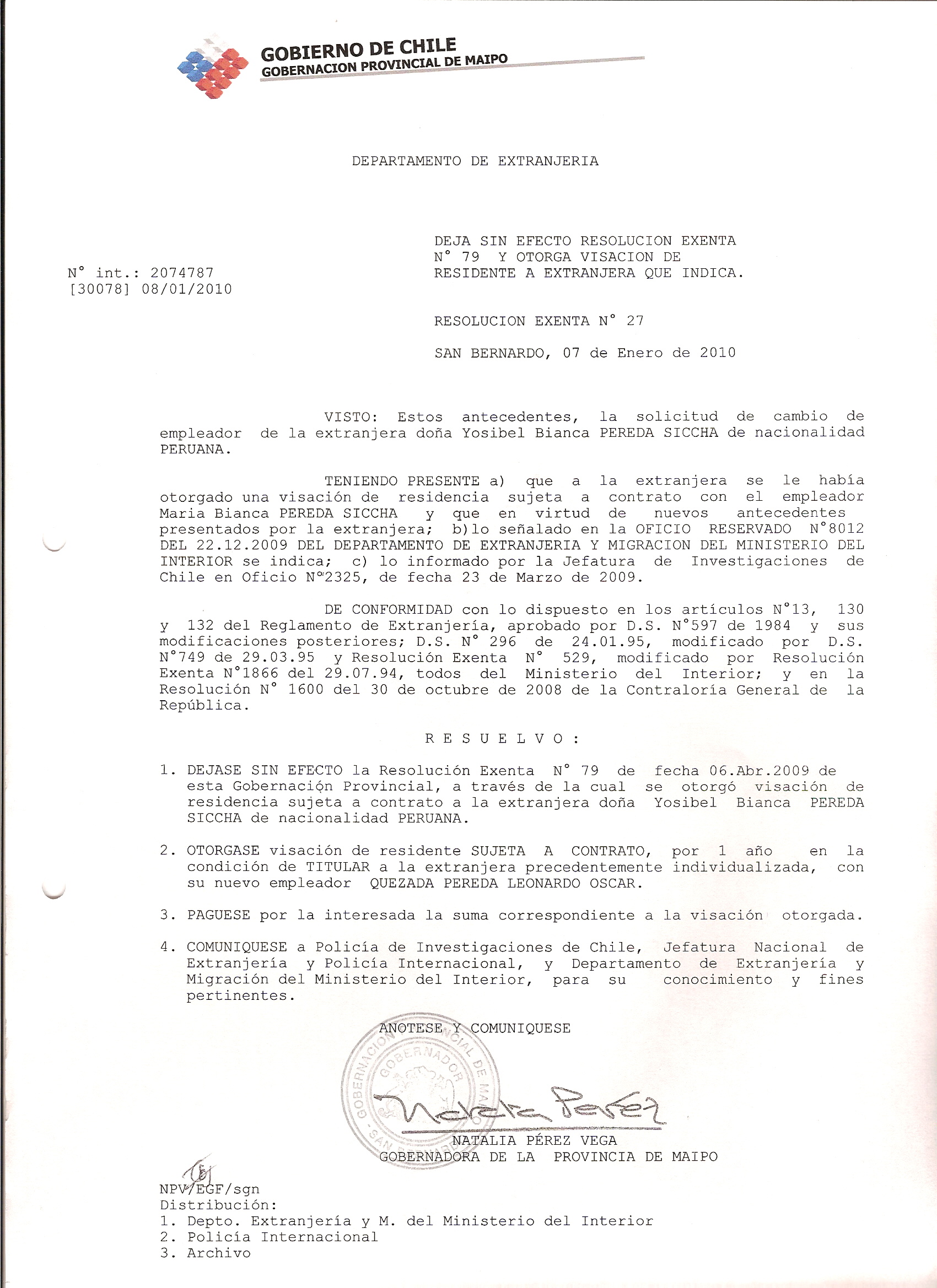DEJA SIN EFECTO RESOLUCION VISA OTORGANDO OTRA VISA |