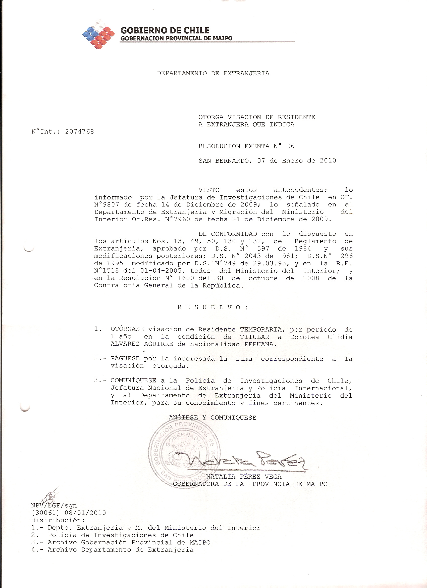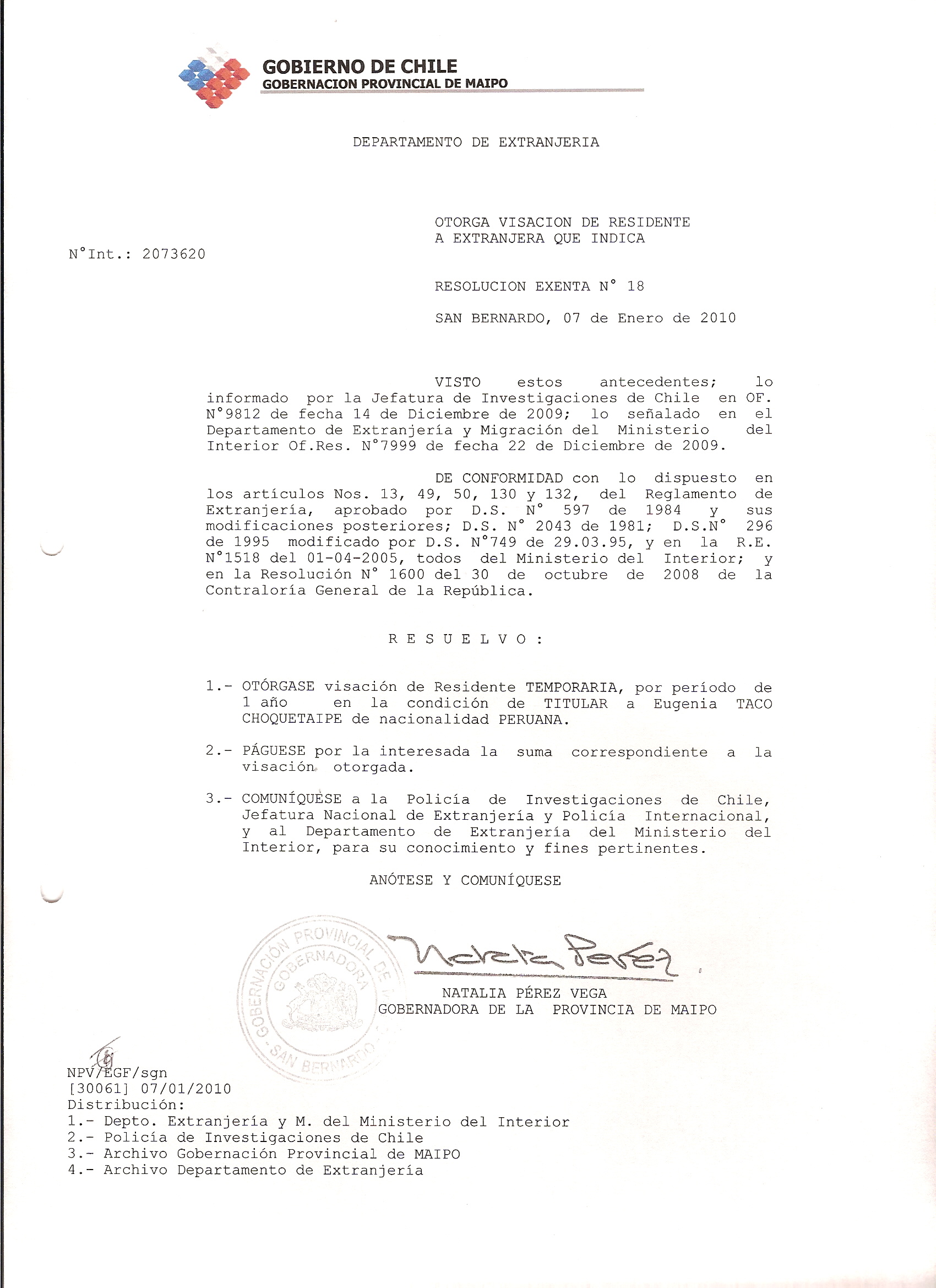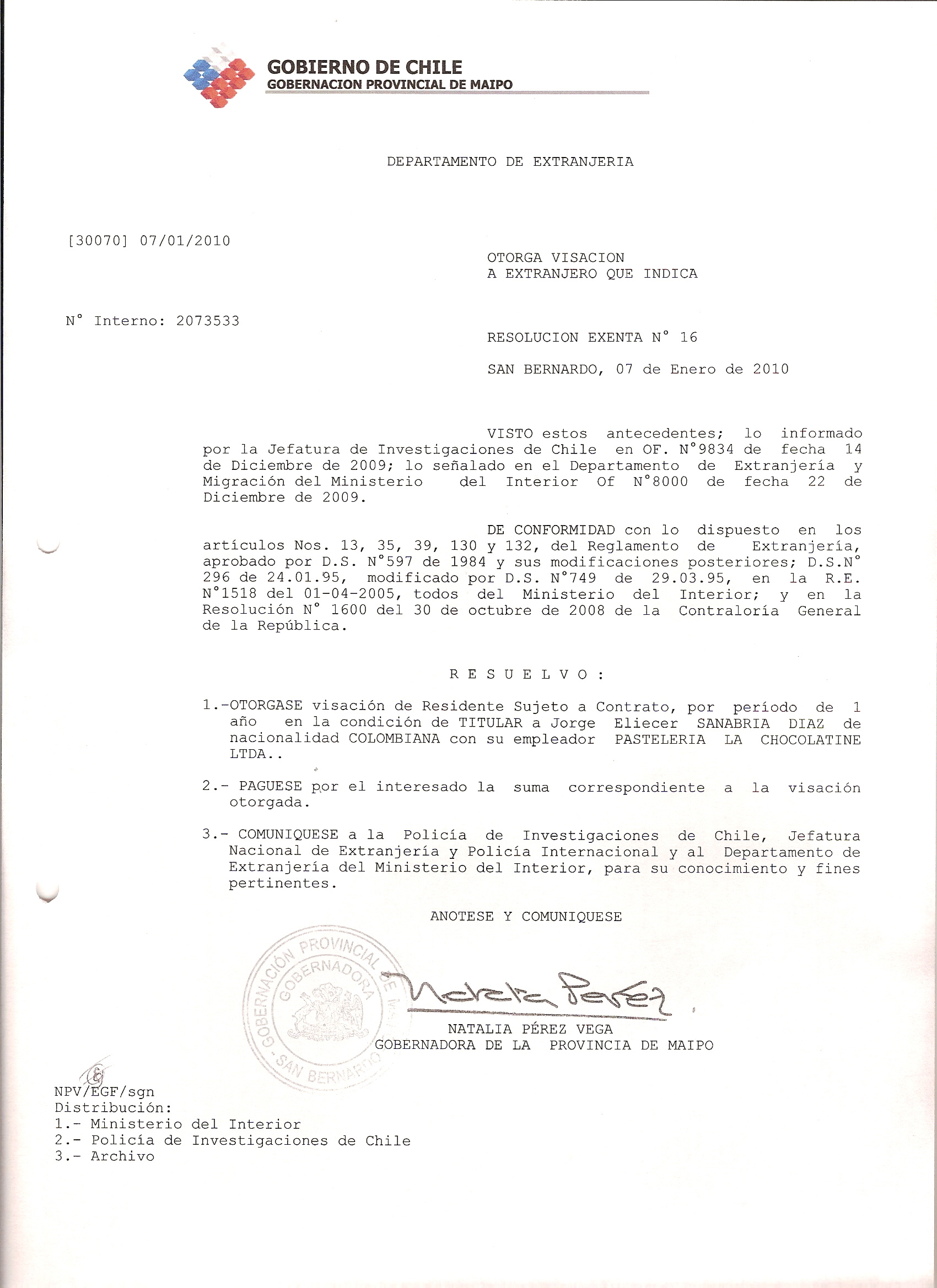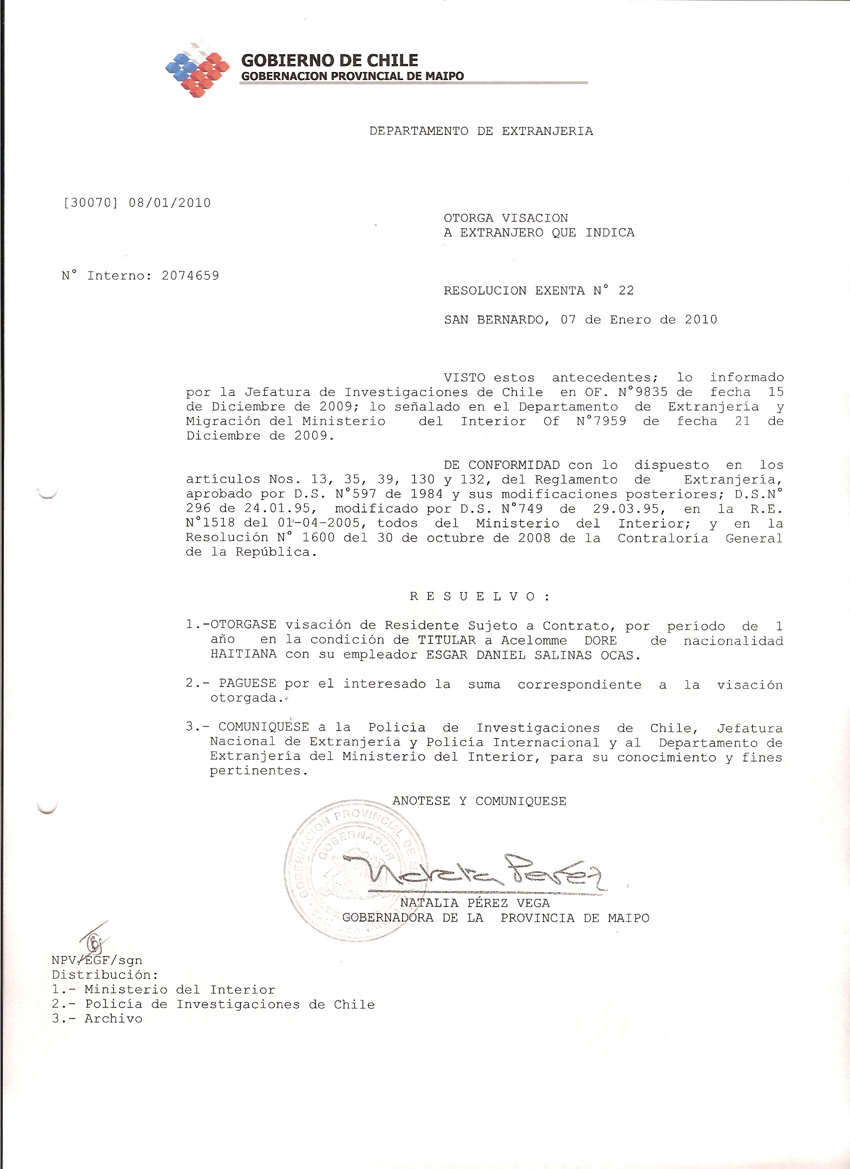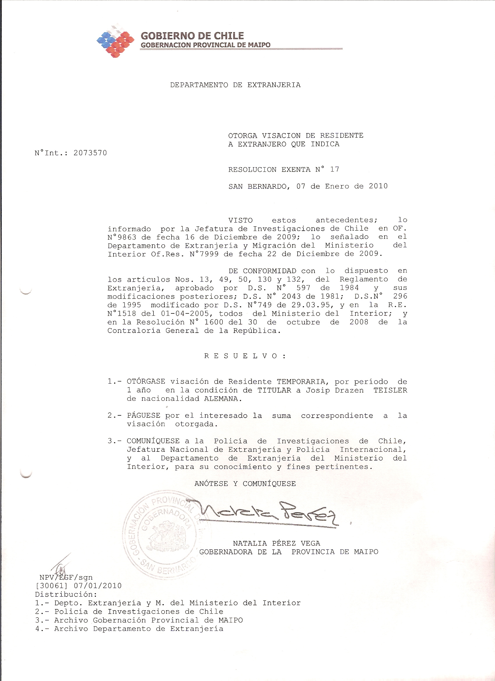 DEJA SIN EFECTO RESOLUCION VISA OTORGANDO OTRA VISA |