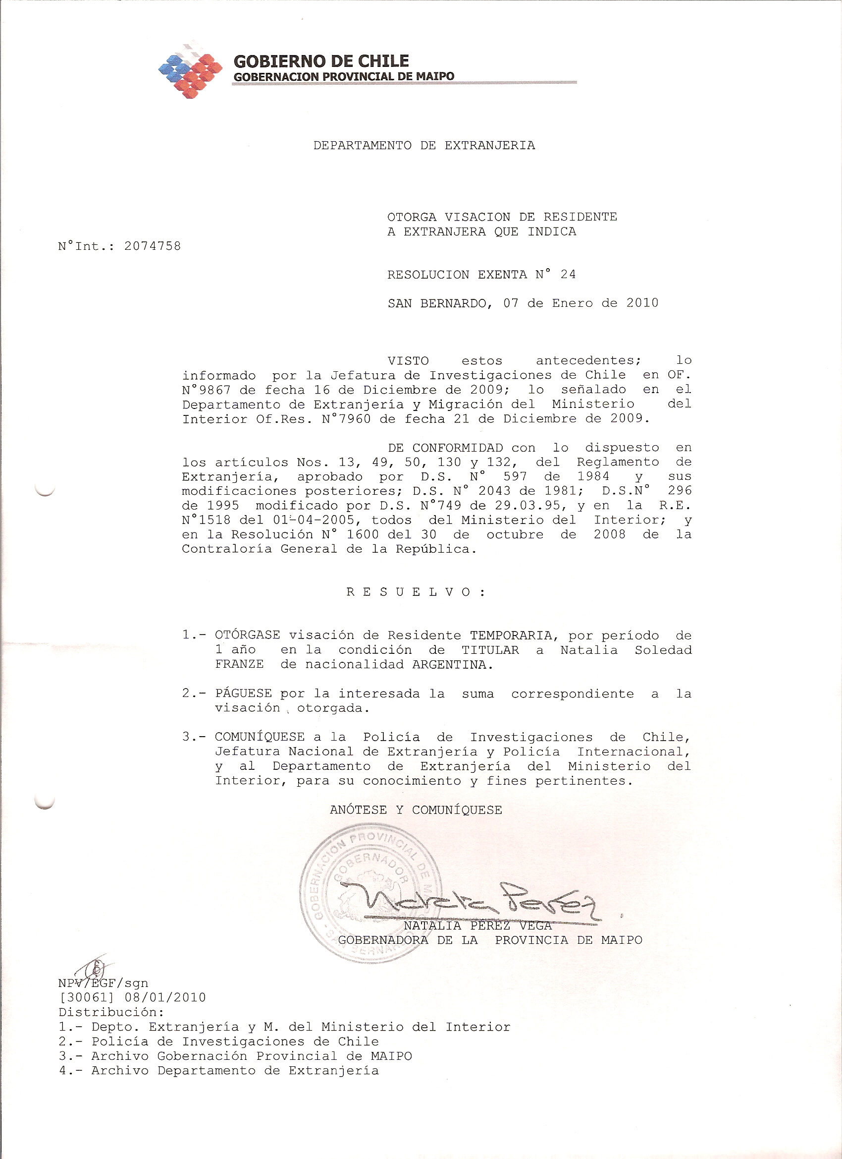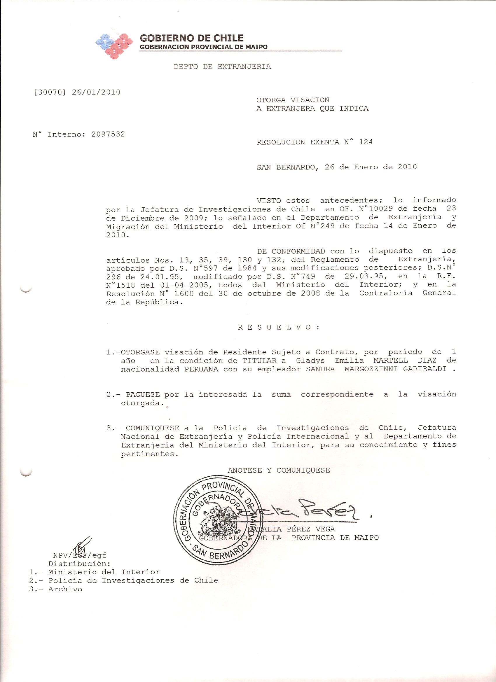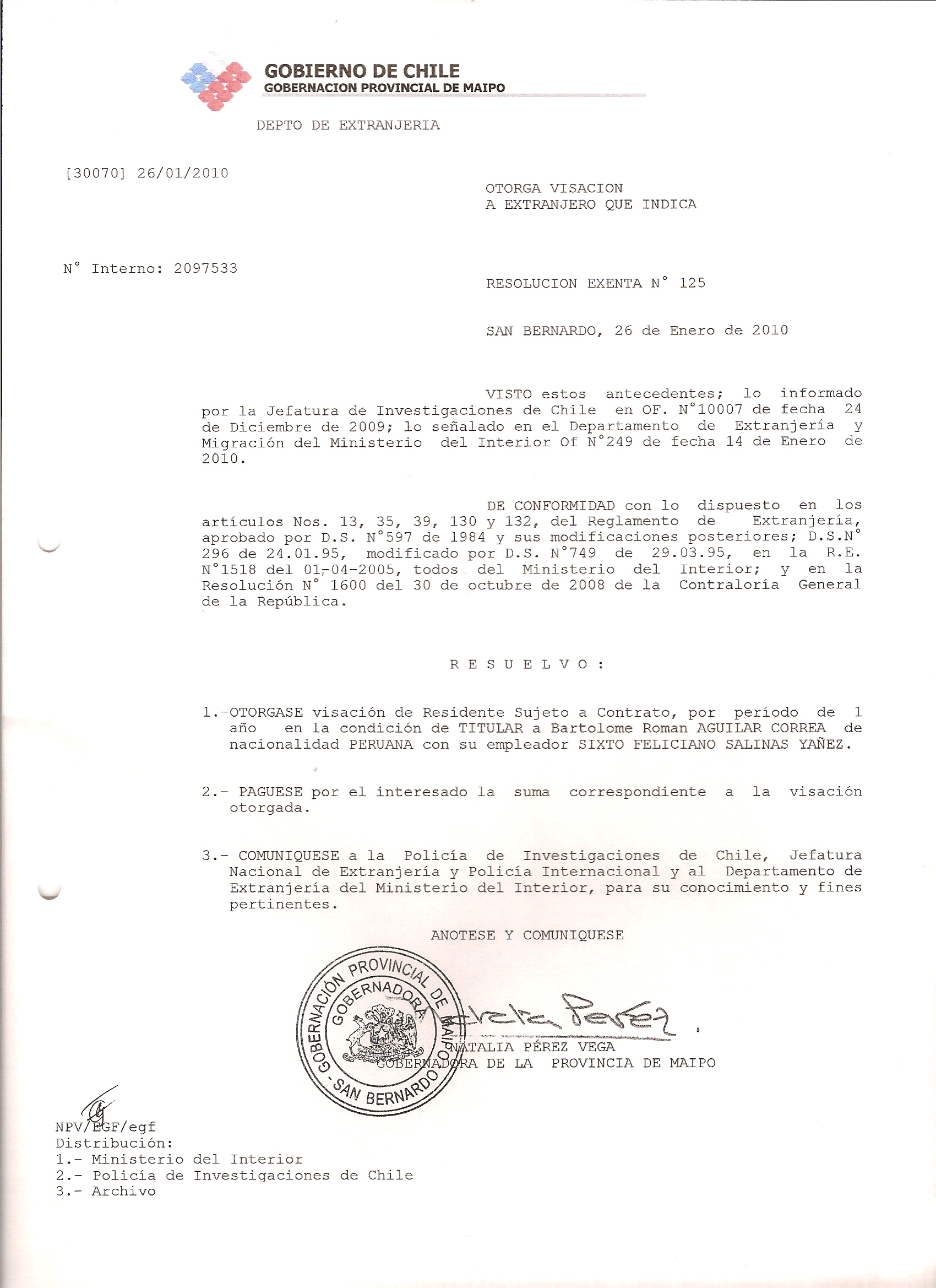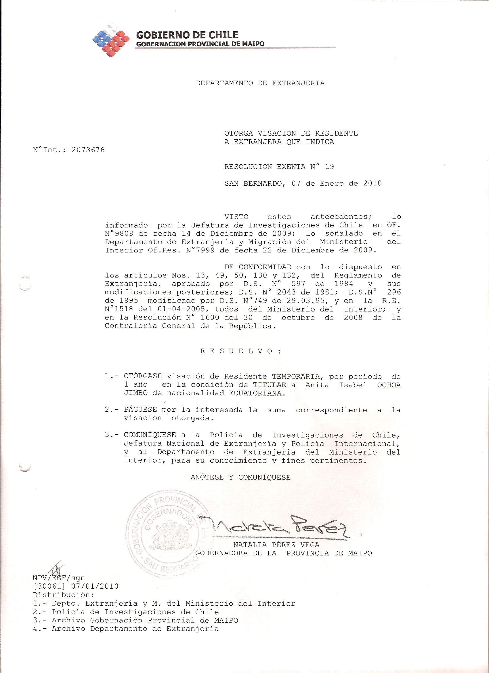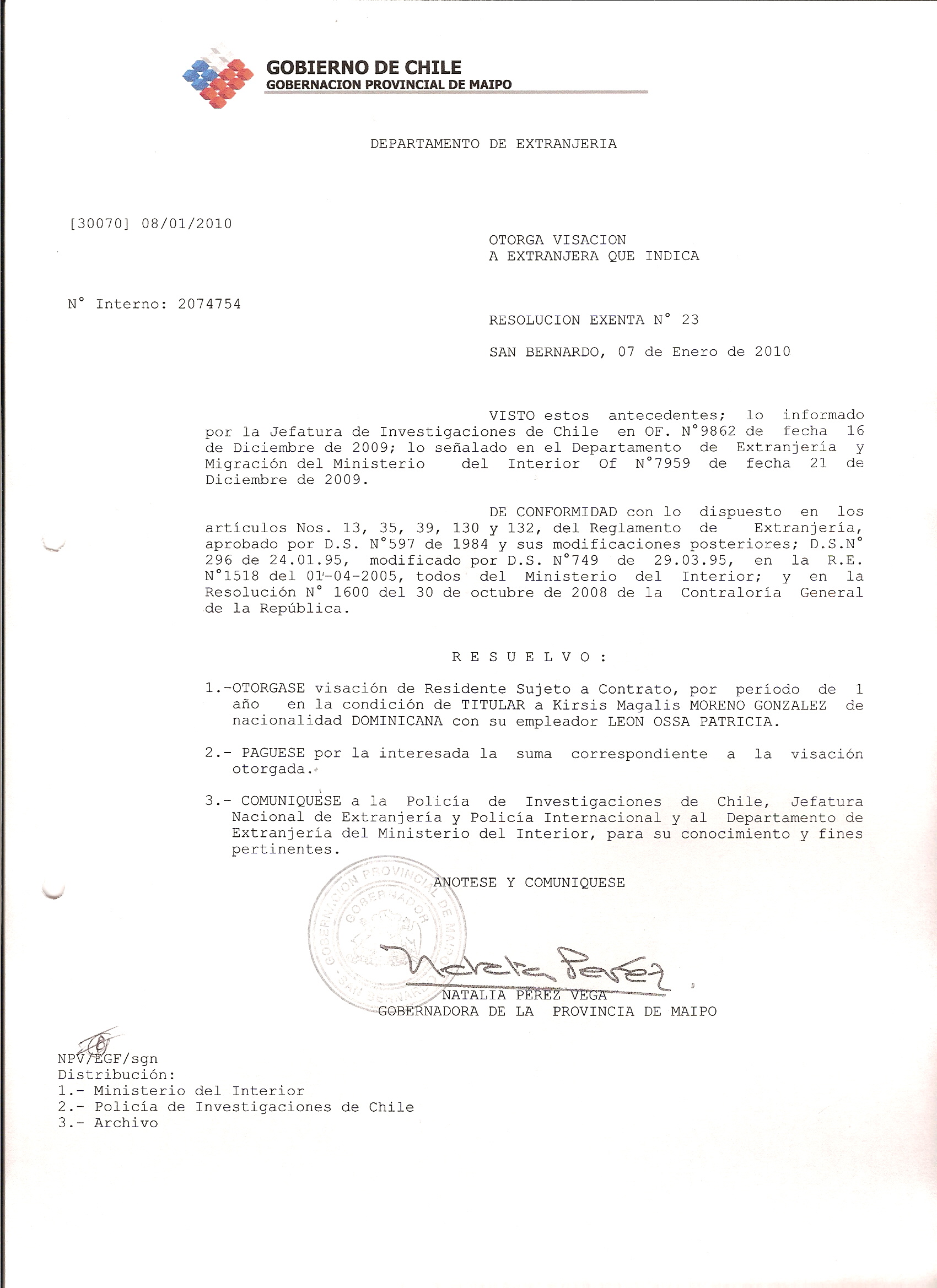 DEJA SIN EFECTO RESOLUCION VISA OTORGANDO OTRA VISA |
