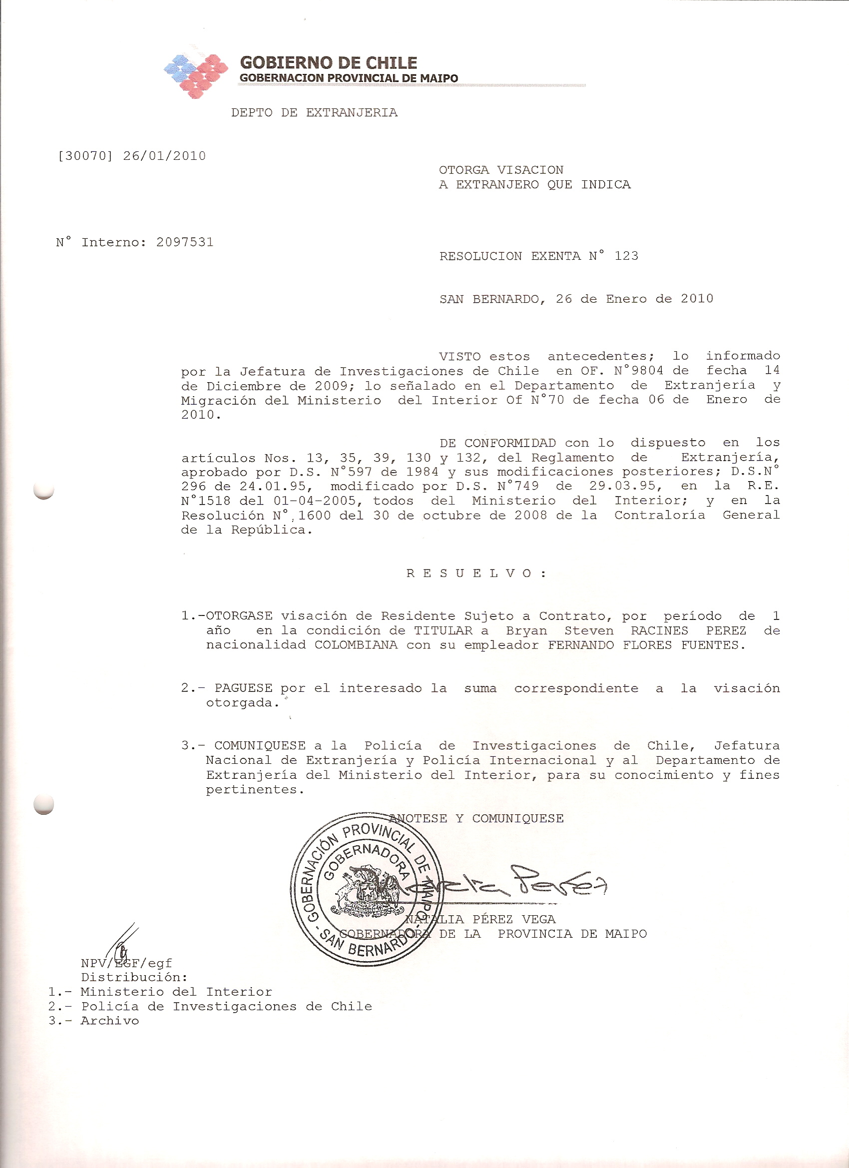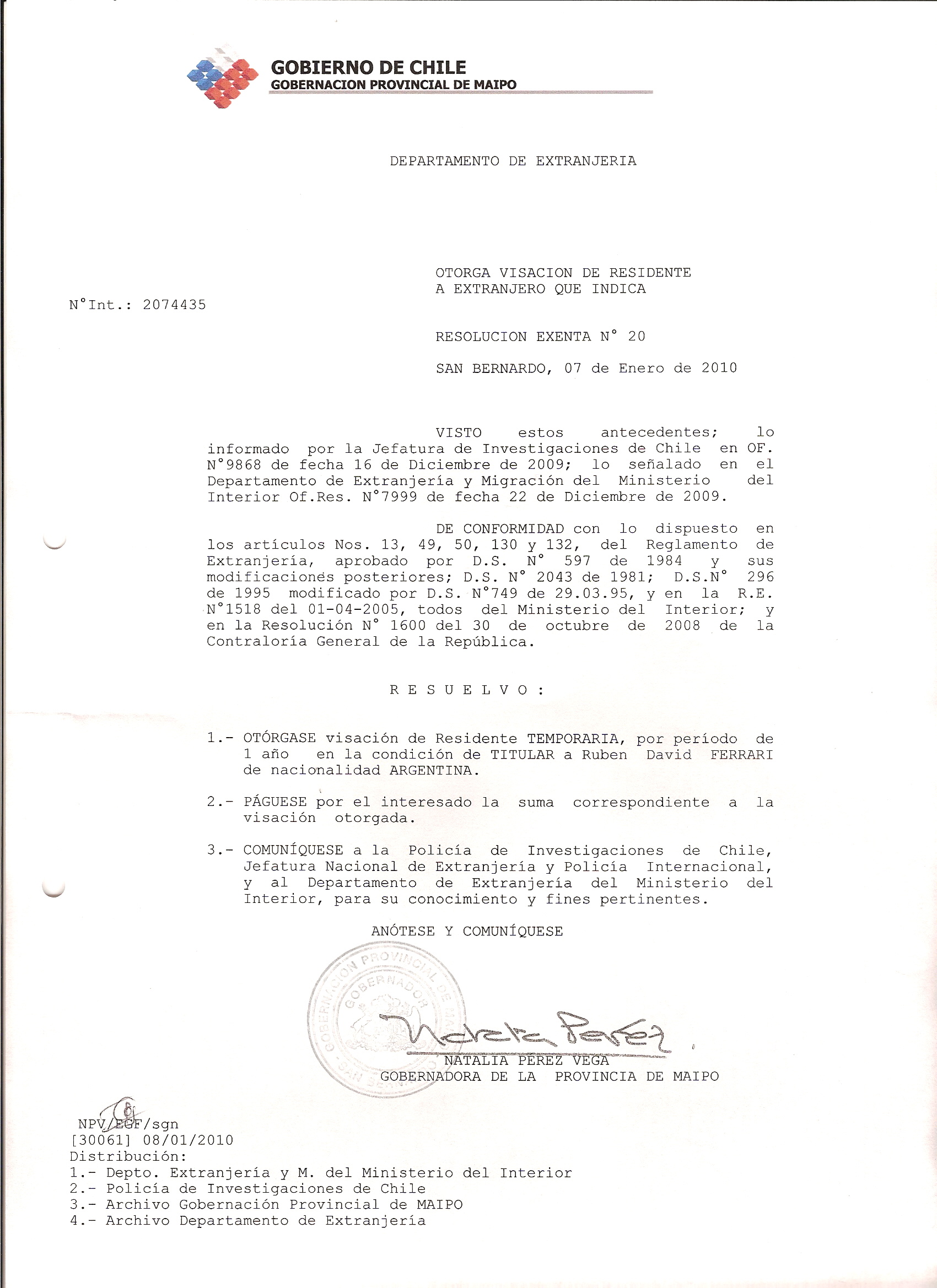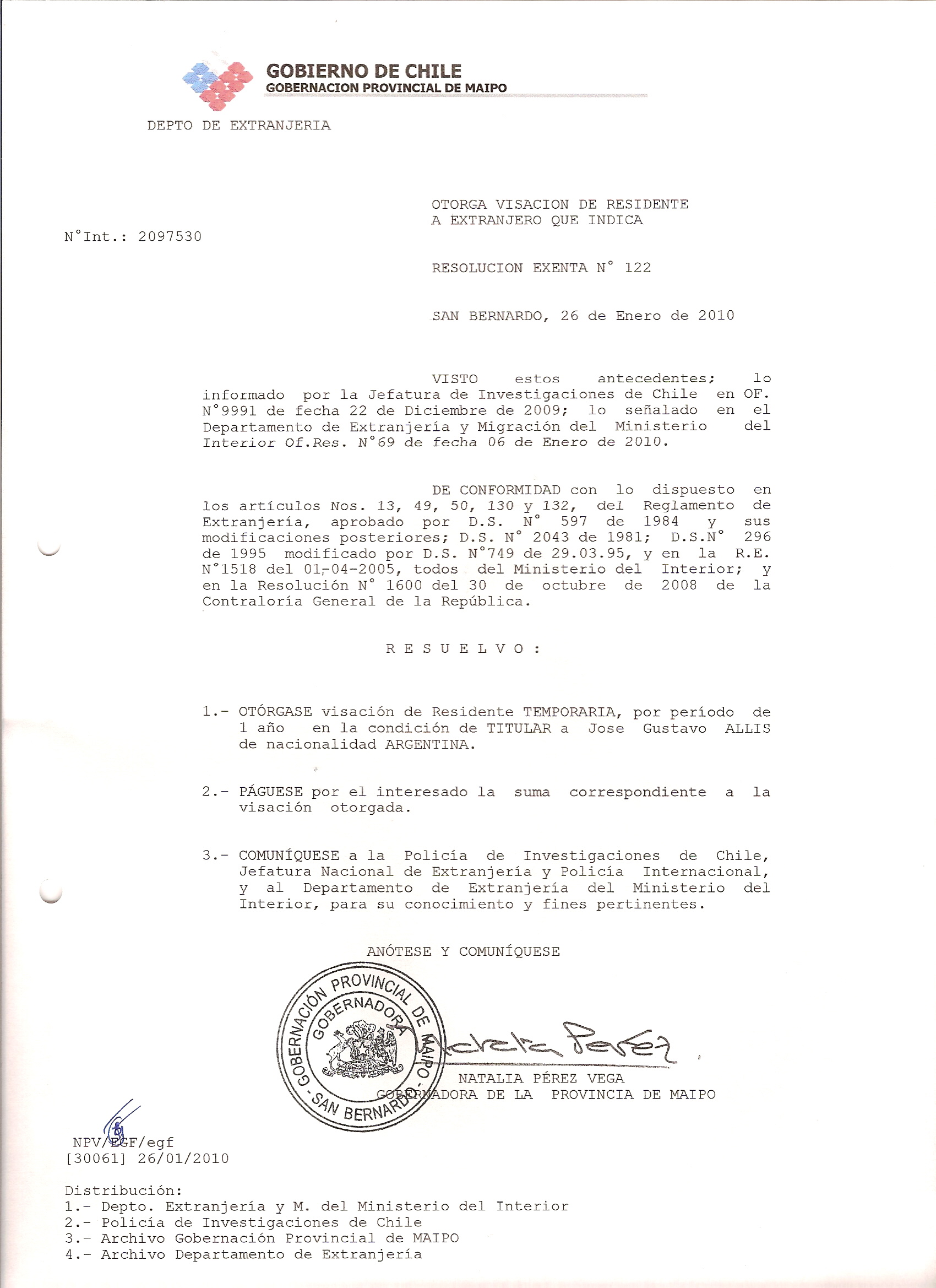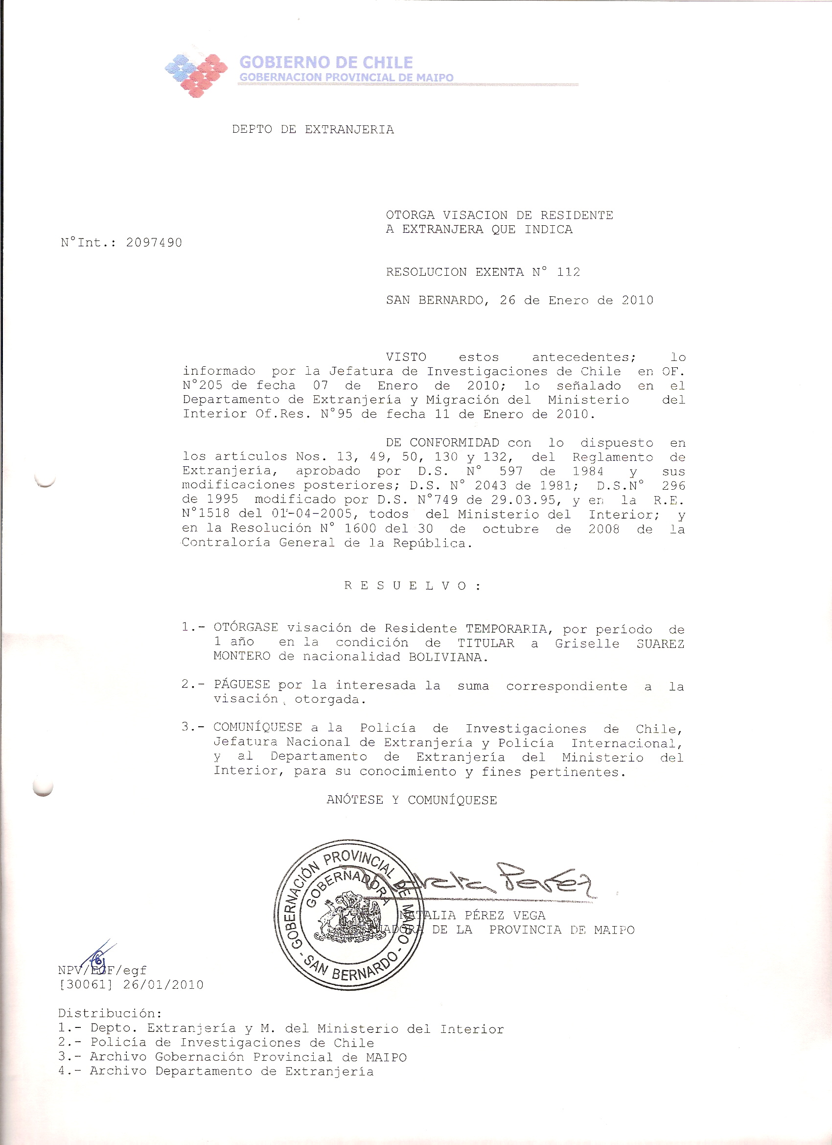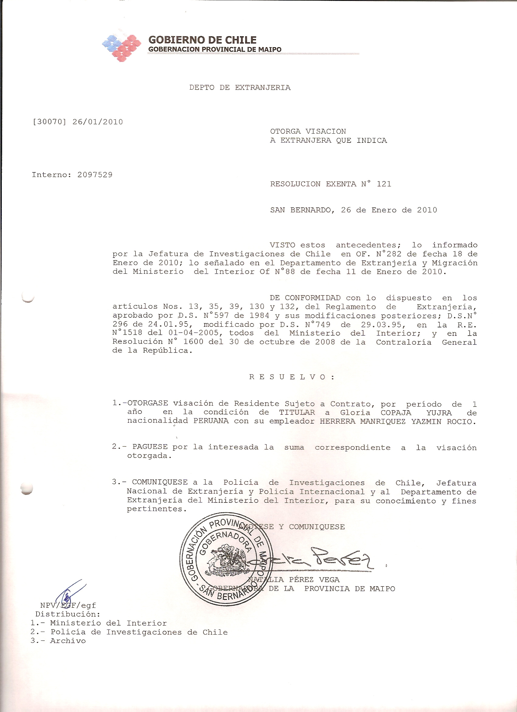 DEJA SIN EFECTO RESOLUCION VISA OTORGANDO OTRA VISA |