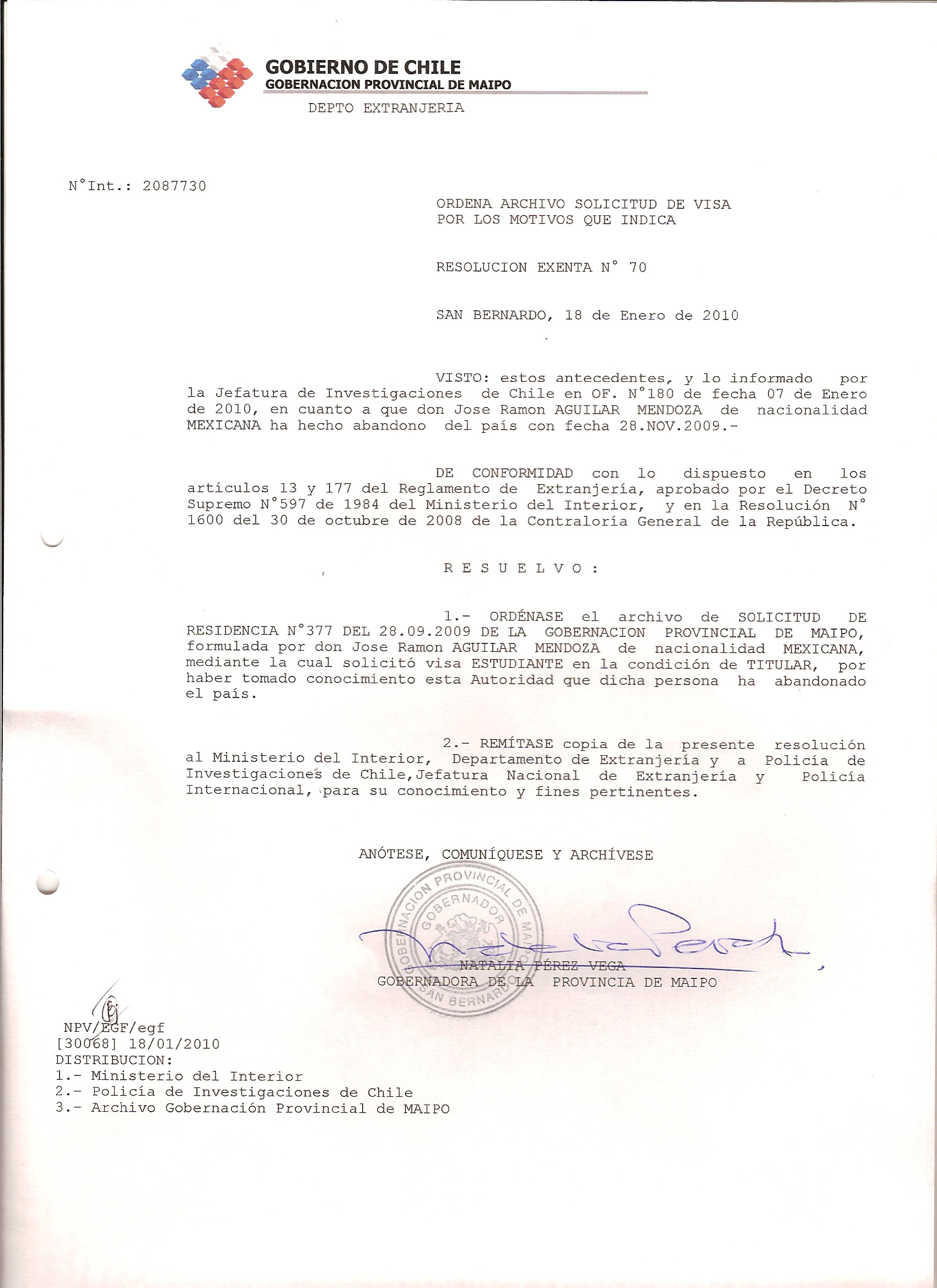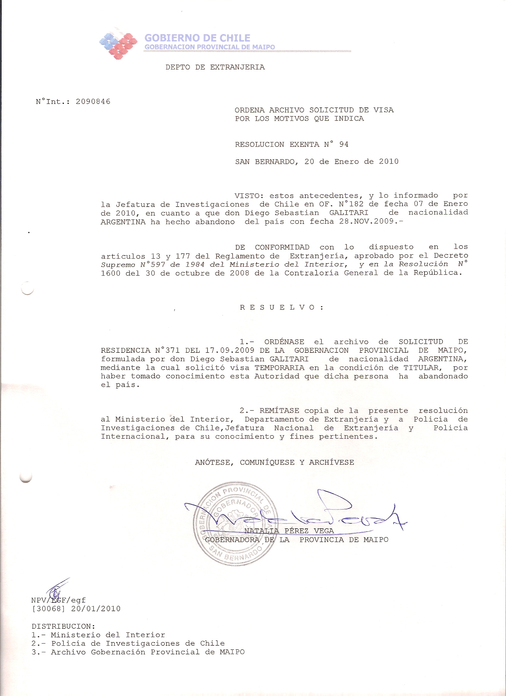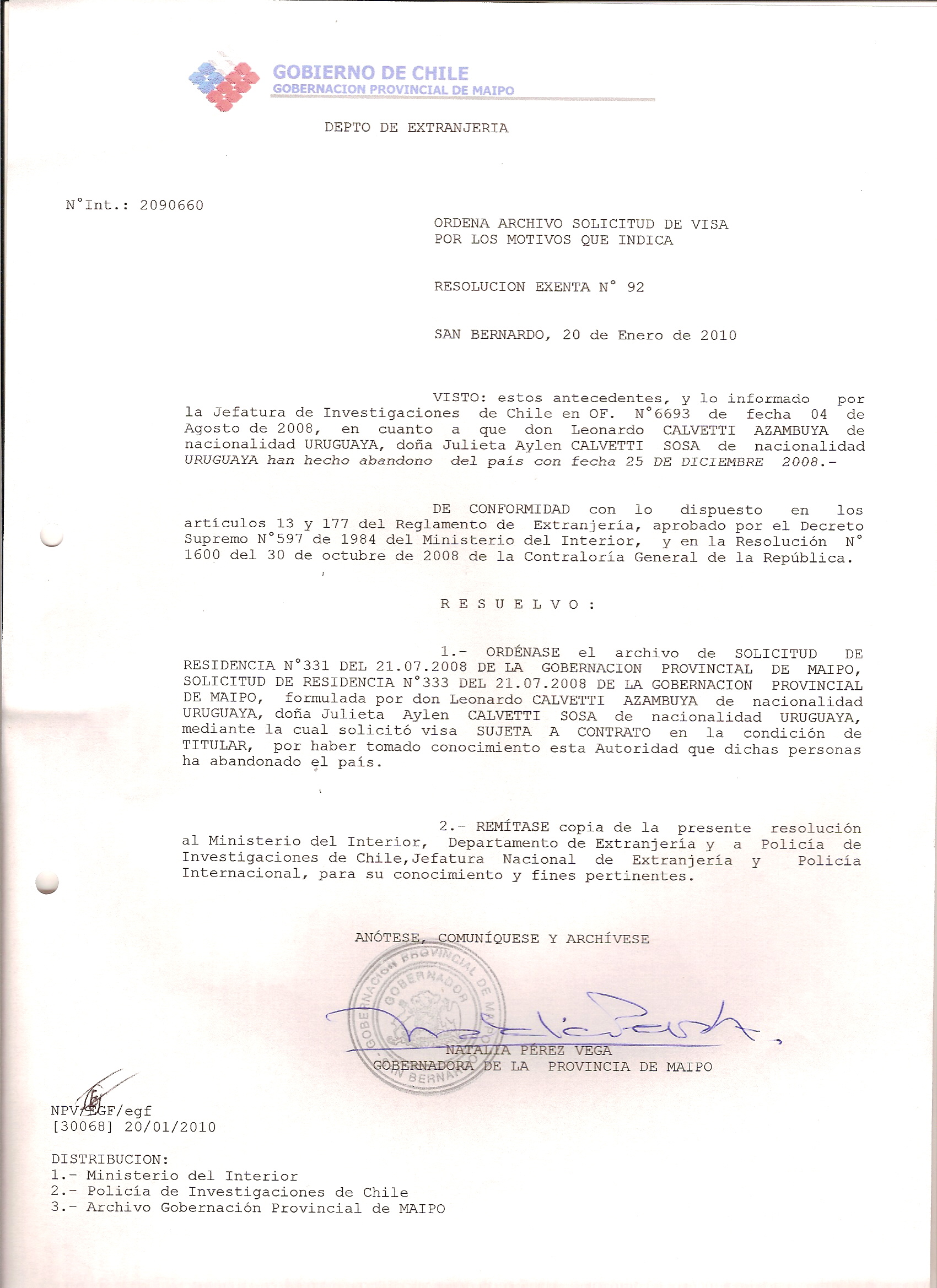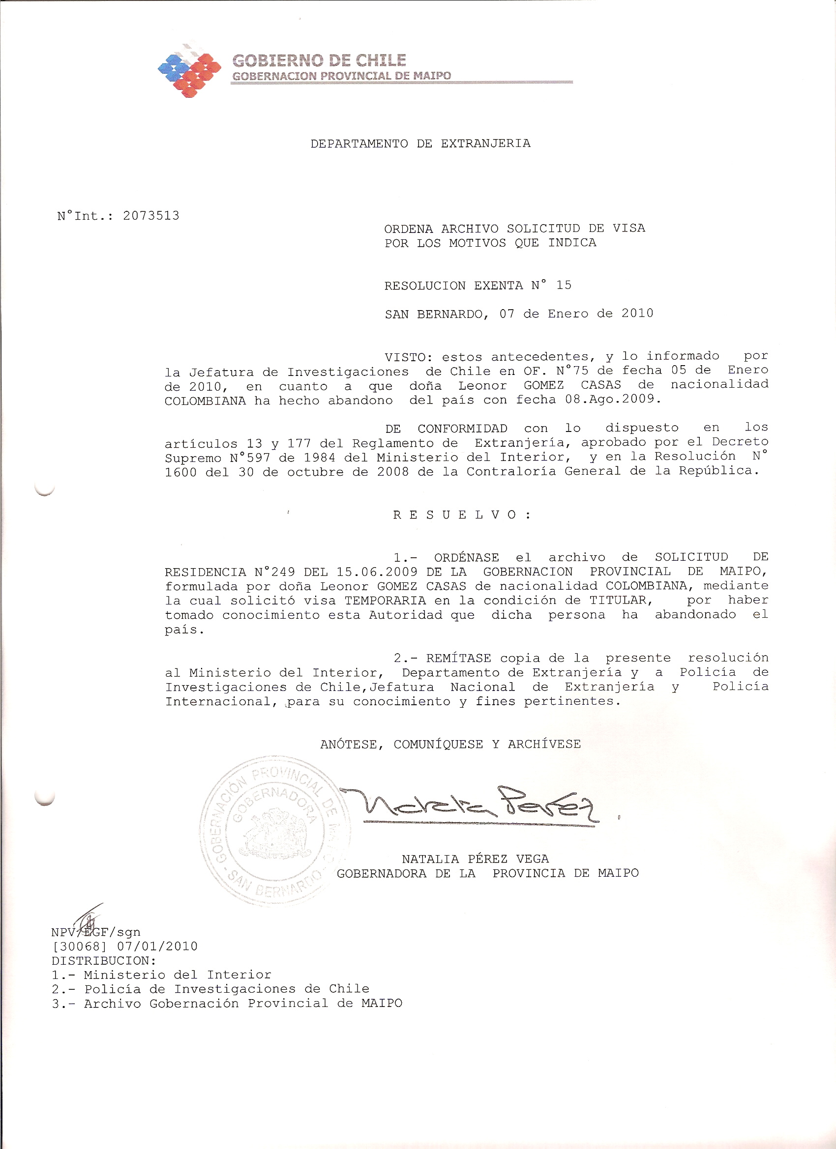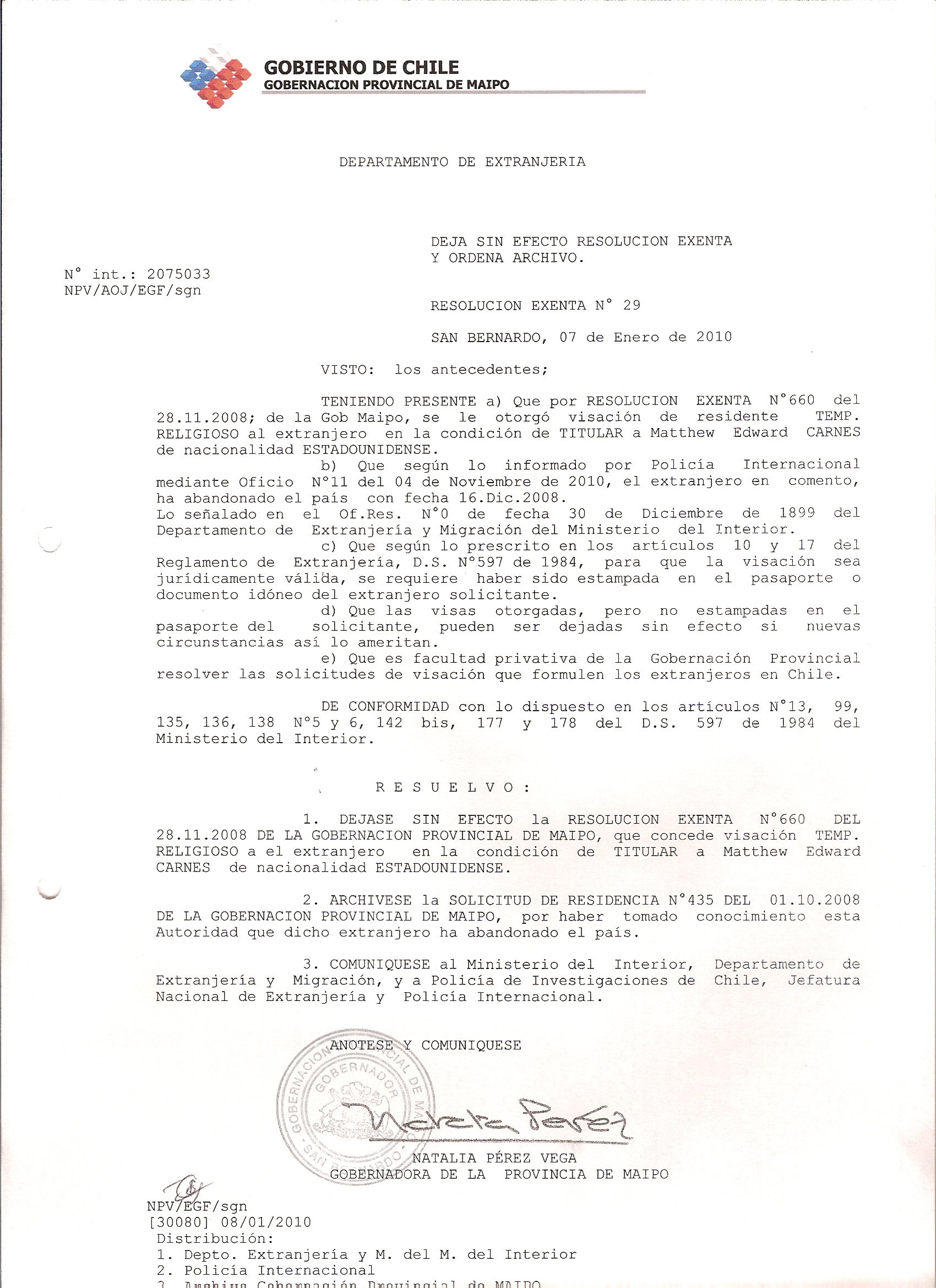 DEJA SIN EFECTO RESOLUCION OTORGA VISA Y ARCHIVA SOLICITUD |