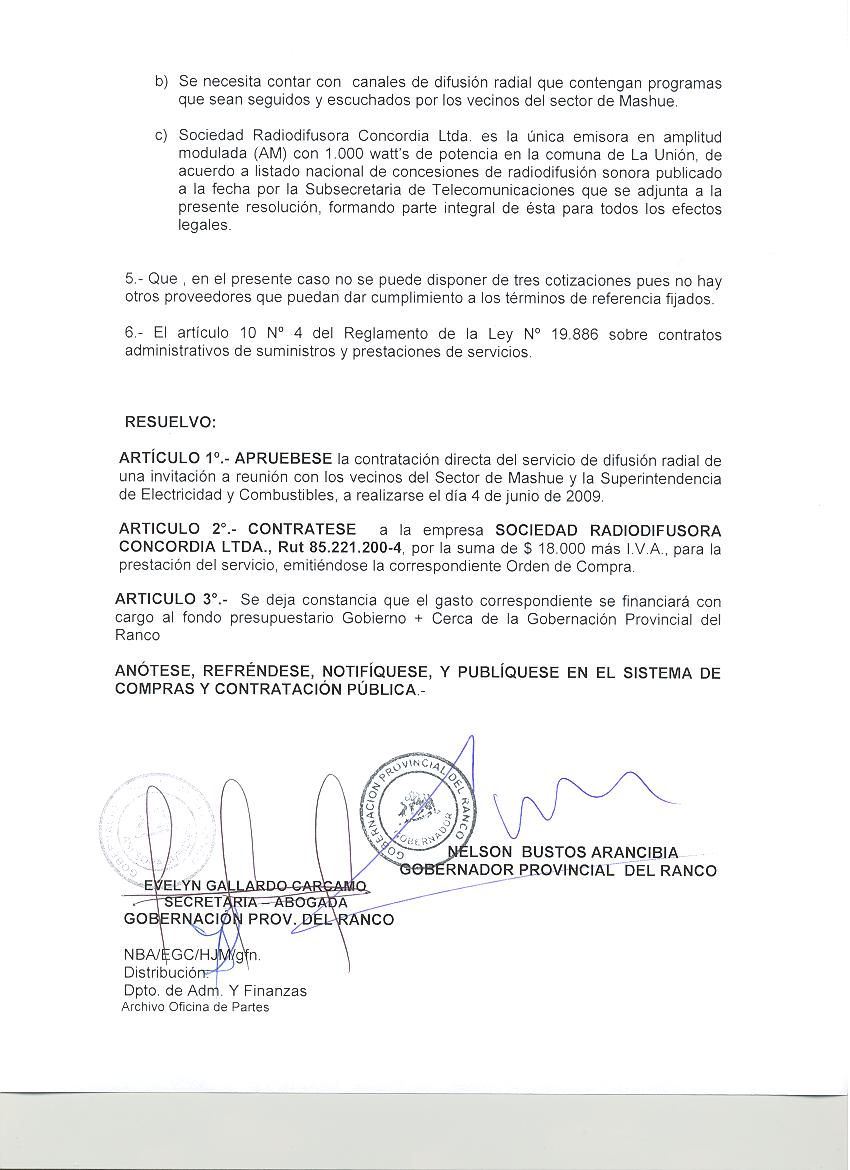 | 26 | 22/05/2009 | Resolución Exenta 488 | Servicio de difusión radial reunión Superintendencia de Electricidad y Combustibles en Mashue, La Unión | 01/06/2009 | 03/06/2009 | Pesos | 21420 | Sociedad Radiodifusora Concordia Limitada | No | No | No | 85.221.200-4 | No | Ver enlace | - | null |