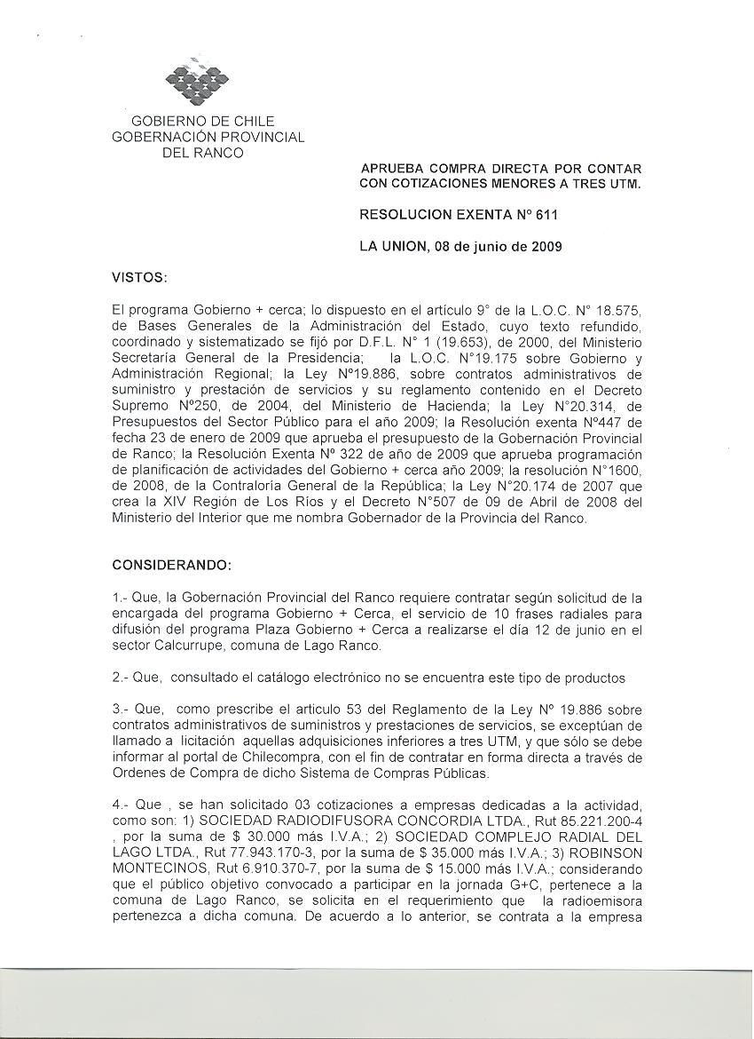 | 29 | 08/06/2009 | Resolución Exenta 611 | Servicio de difusión radial Gobierno + Cerca Calcurrupe, Lago Ranco | 08/06/2009 | 11/06/2009 | Pesos | 41650 | Sociedad Complejo Radial del Lago Limitada | No | No | No | 77.943.170-3 | No | Ver enlace | - | null |