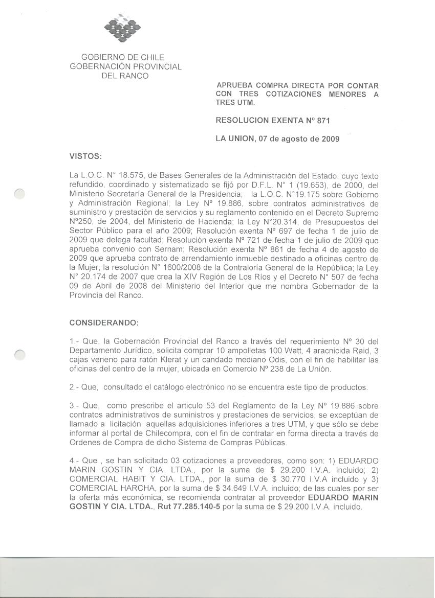 | 30 | 07/08/2009 | Resolución Exenta 871 | Adquisición de materiales de aseo, con el fin de habilitar Centro de la Mujer | 07/08/2009 | 10/08/2009 | Pesos | 26700 | Eduardo Marín Gostín y Cia. Limitada | No | No | No | 77.285.140-5 | Eduardo Marín | Ver enlace | - | null |