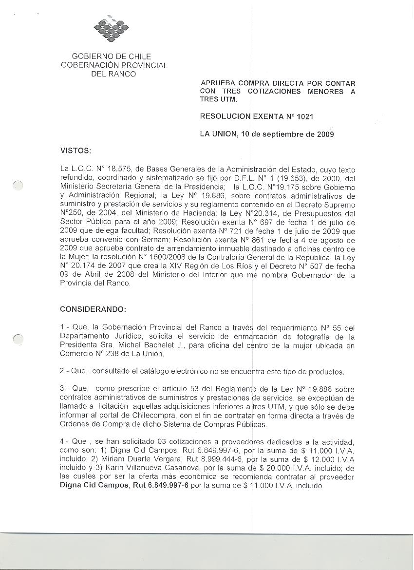 | 34 | 11/09/2009 | Resolución Exenta N° 1021 | Enmarcación de fotografía Presidenta para Centro de la Mujer | 11/09/2009 | 11/09/2009 | Pesos | 11000 | Digna Cid campos | No | No | No | 6.849.997-6 | No | Ver enlace | - | null |