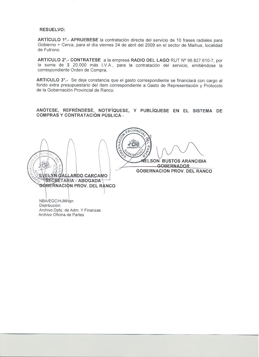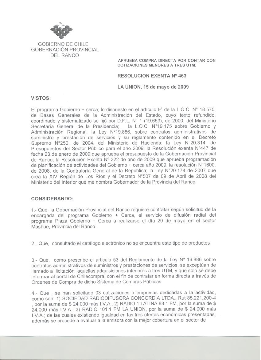 | 22 | 15/05/2009 | Resolución Exenta N° 463 | Adquisición de 8 frases radiales programa G+C Mashue | 15/05/2009 | 15/05/2009 | Pesos | 28560 | Sociedad Radiodifusora Concordia Ltda. | No | No | No | 85.221.200-4 | No | Ver enlace | - | null |