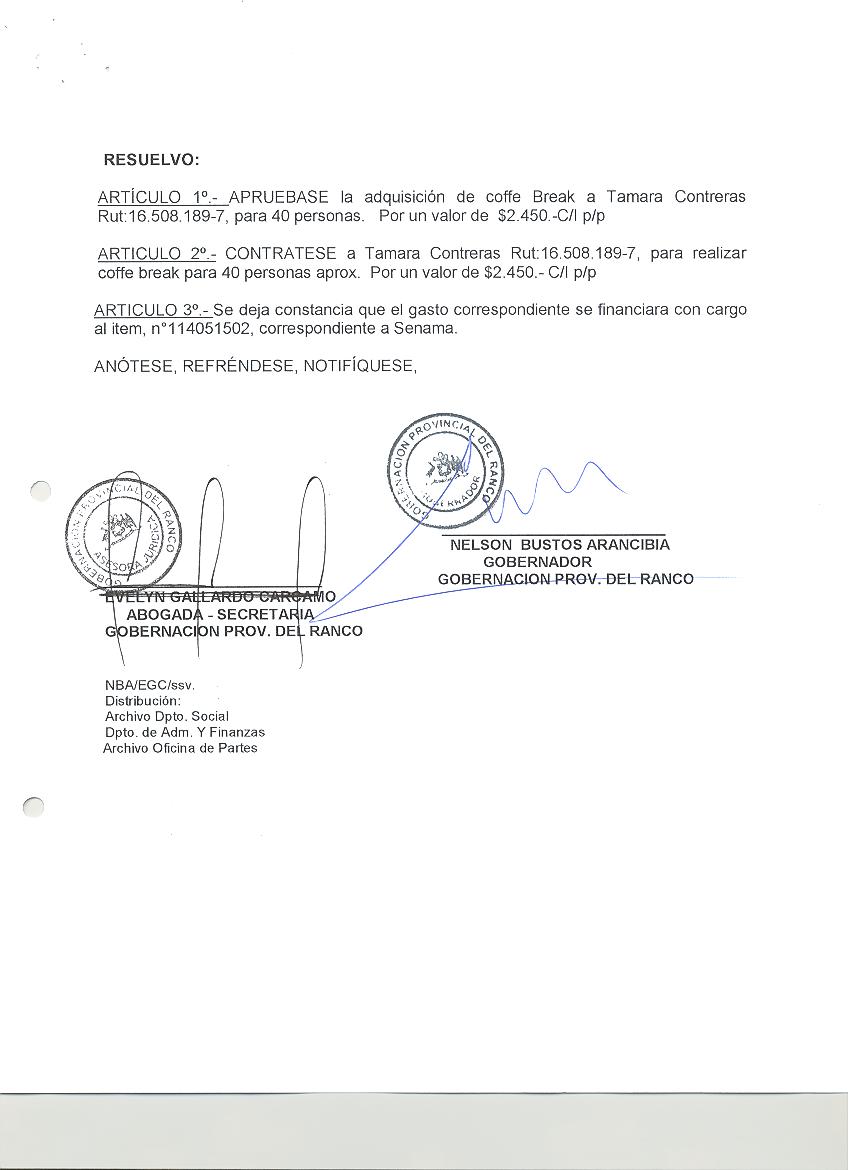 | 3 | 21/04/2009 | Resolución Exenta 371 | Servicio coffee break, encuentro de Adulto Mayor Río Bueno | 21/04/2009 | 21/04/2009 | Pesos | 98000 | Tamara Sofía Contreras Sepúlveda | Contreras | Sepúlveda | Tamara | 16.508.187-7 | Tamara Contreras | Ver enlace | - | null |