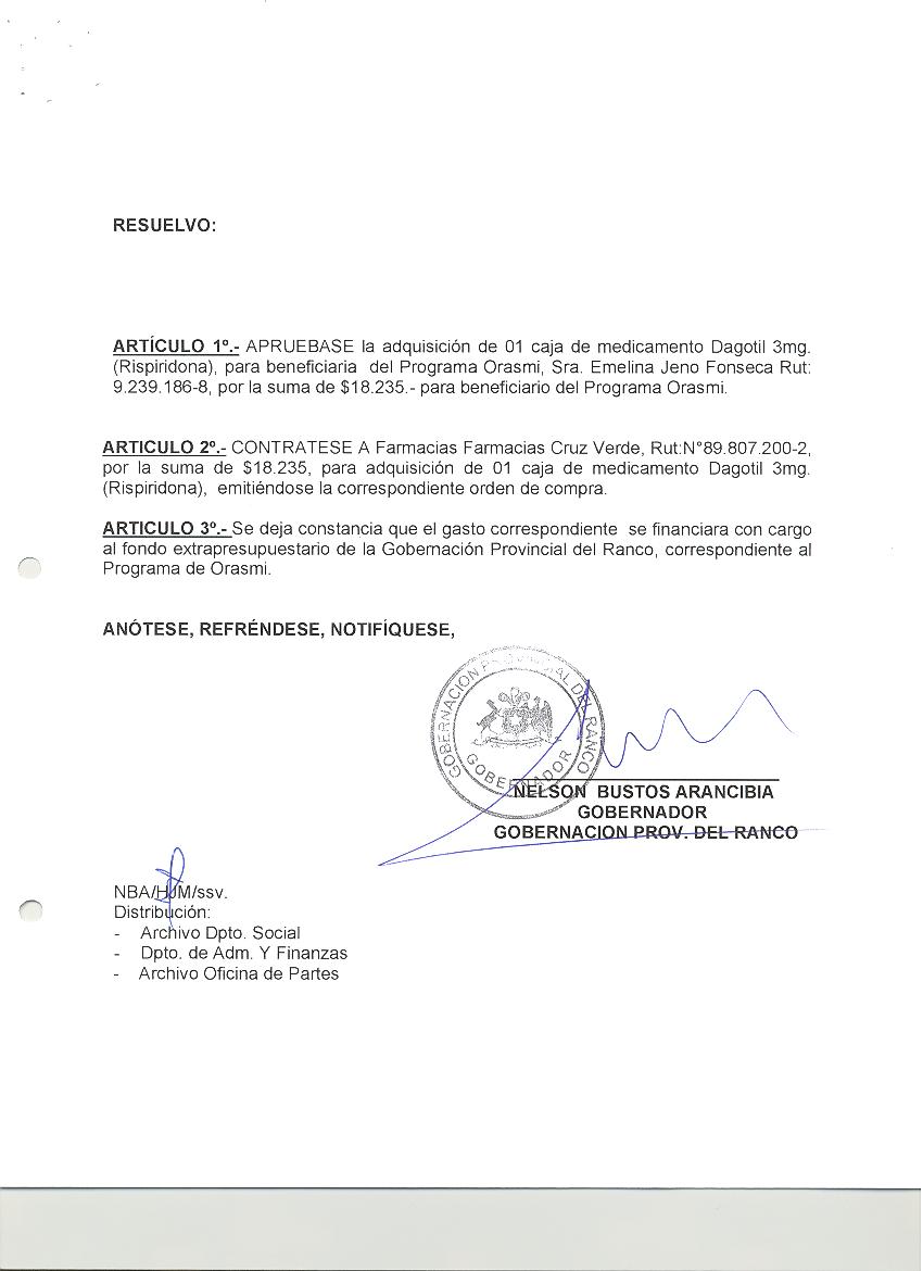 | 6 | 23/04/2009 | Resolución Exenta 385 | Compra medicamento programa Orasmi | 23/04/2009 | 23/04/2009 | Pesos | 18235 | Farmacia Cruz Verde | No | No | No | 89.807.200-2 | No | Ver enlace | - | null |
