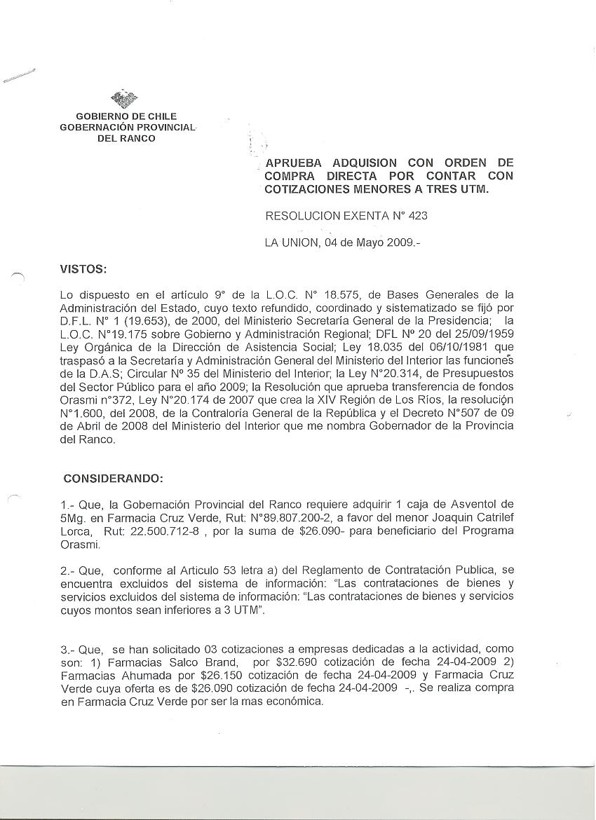 | 12 | 04/05/2009 | Resolución Exenta N° 423 | Adquisición 1 caja Asventol 5 mg. | 04/05/2009 | 04/05/2009 | Pesos | 26090 | Farmacias Cruz verde SA | No | No | No | 89.807.200-2 | No | Ver enlace | - | null |