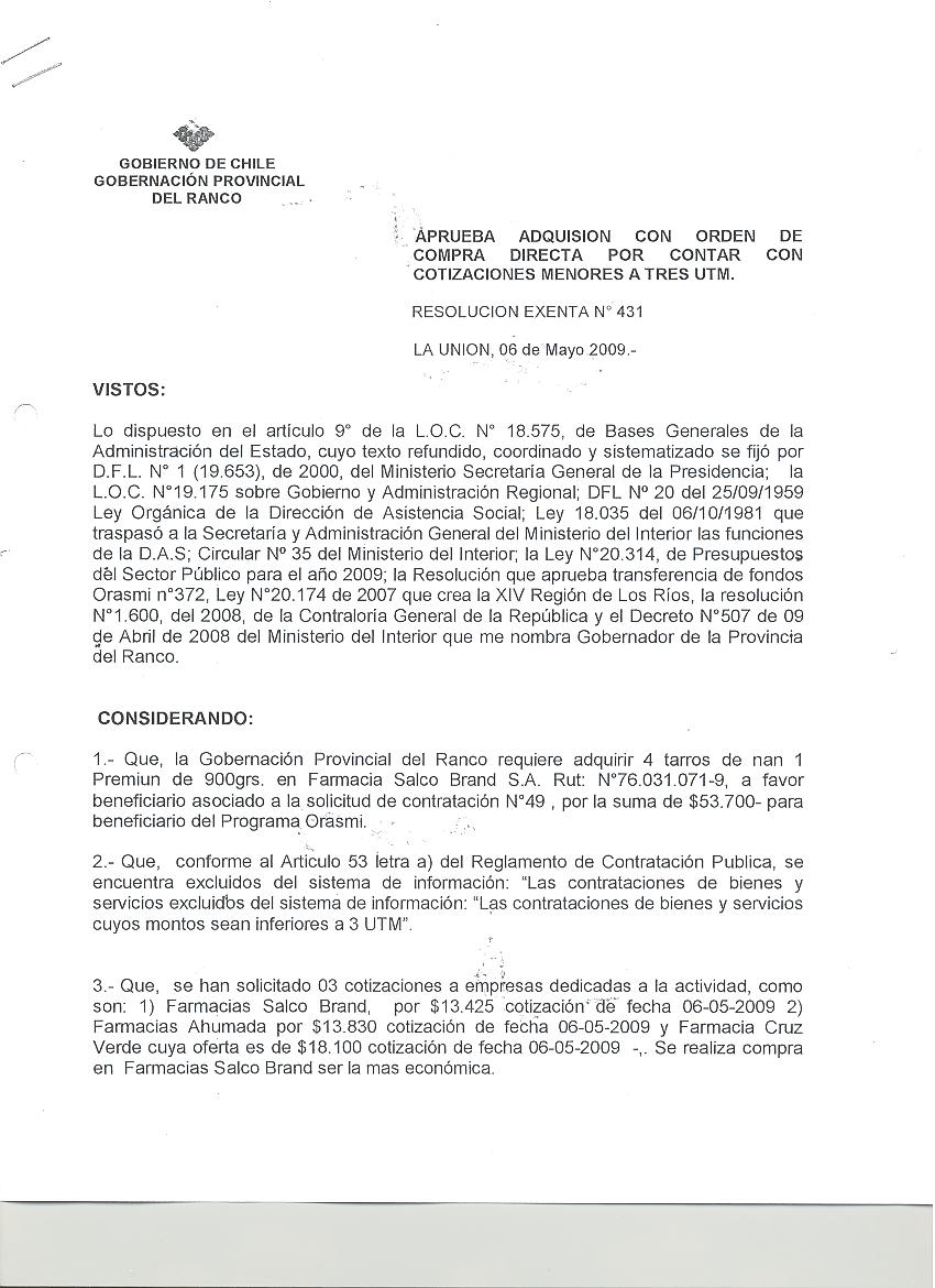 | 19 | 06/05/2009 | Resolución Exenta N° 431 | Adquisición de 4 tarros de Nan 1 Premiun 900 gr. | 06/05/2009 | 06/05/2009 | Pesos | 53700 | Farmacias Salco Brand SA | No | No | No | 76.031.071-9 | No | Ver enlace | - | null |