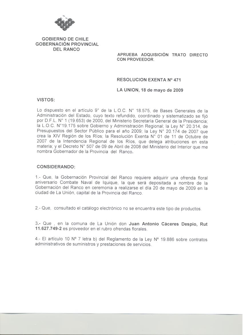 | 23 | 18/05/2009 | Resolución Exenta N° 471 | Adquisición de 1 ofrenda floral aniversario Combate Naval de Iquique | 18/05/2009 | 18/05/2009 | Pesos | 91400 | Juan Antonio Cáceres Despío | Cáceres | Despío | Juan Antonio | 11.627.749-2 | No | Ver enlace | - | null |