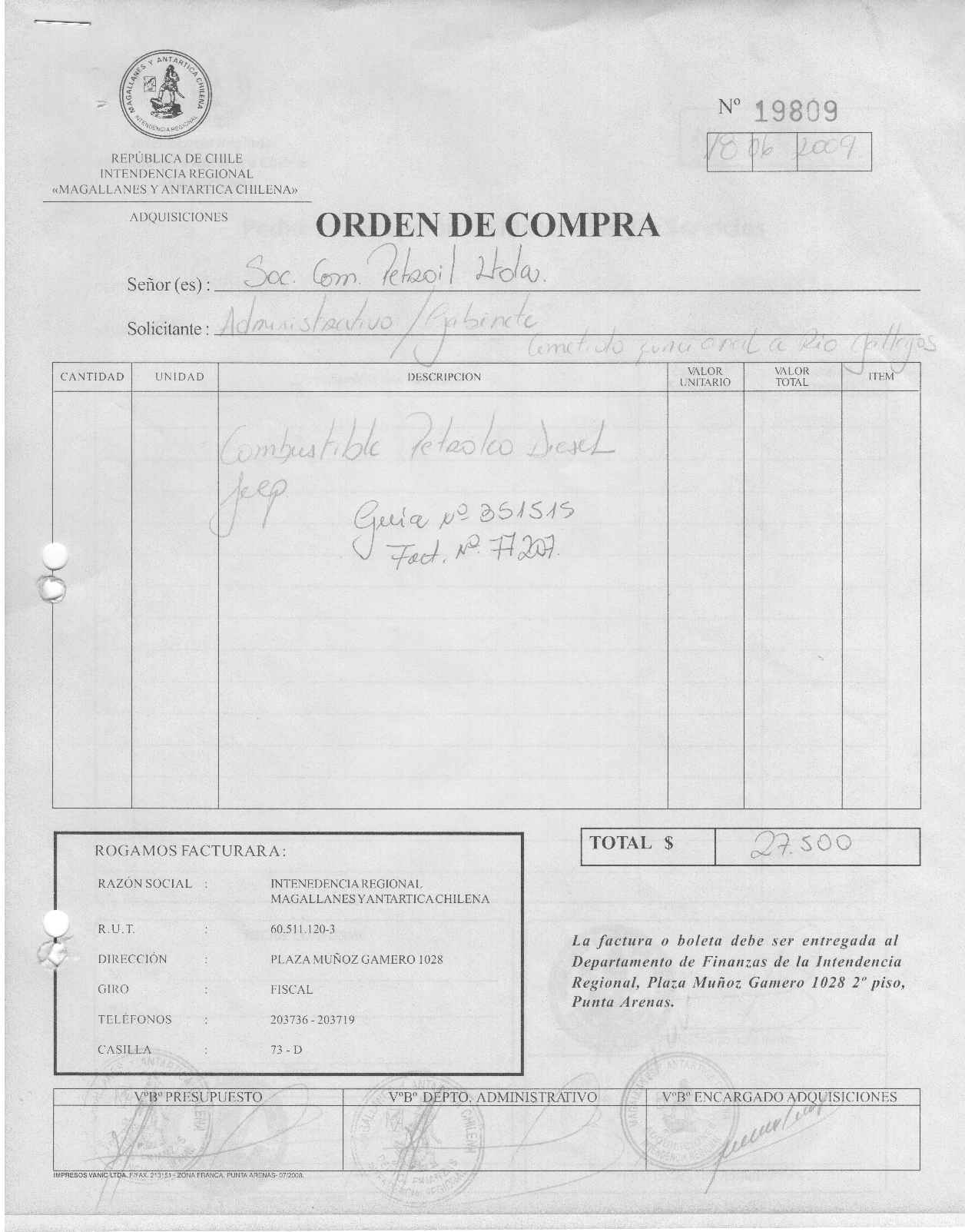 | 53 | 18/06/2009 | Orden de Compra N° 19809 | Combustible | 18/06/2009 | 18/06/2009 | Pesos | 27.500 | Petroil Ltda. | 77.196.790-6 | Ver enlace | - | null | ||||