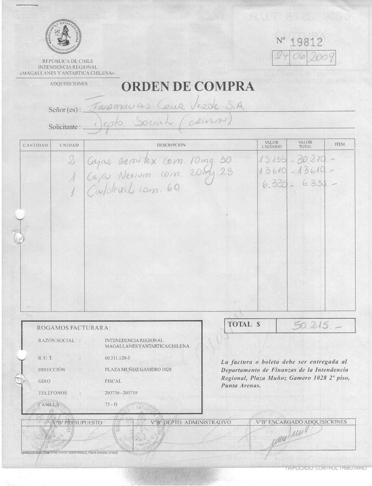 | 56 | 24/06/2009 | Orden de Compra N° 19812 | Orasmi, medicamento ayuda social | 24/06/2009 | 24/06/2009 | Pesos | 50.215 | Farmacias Cruz Verde S.A. | 89.807.200-2 | Ver enlace | - | null | ||||