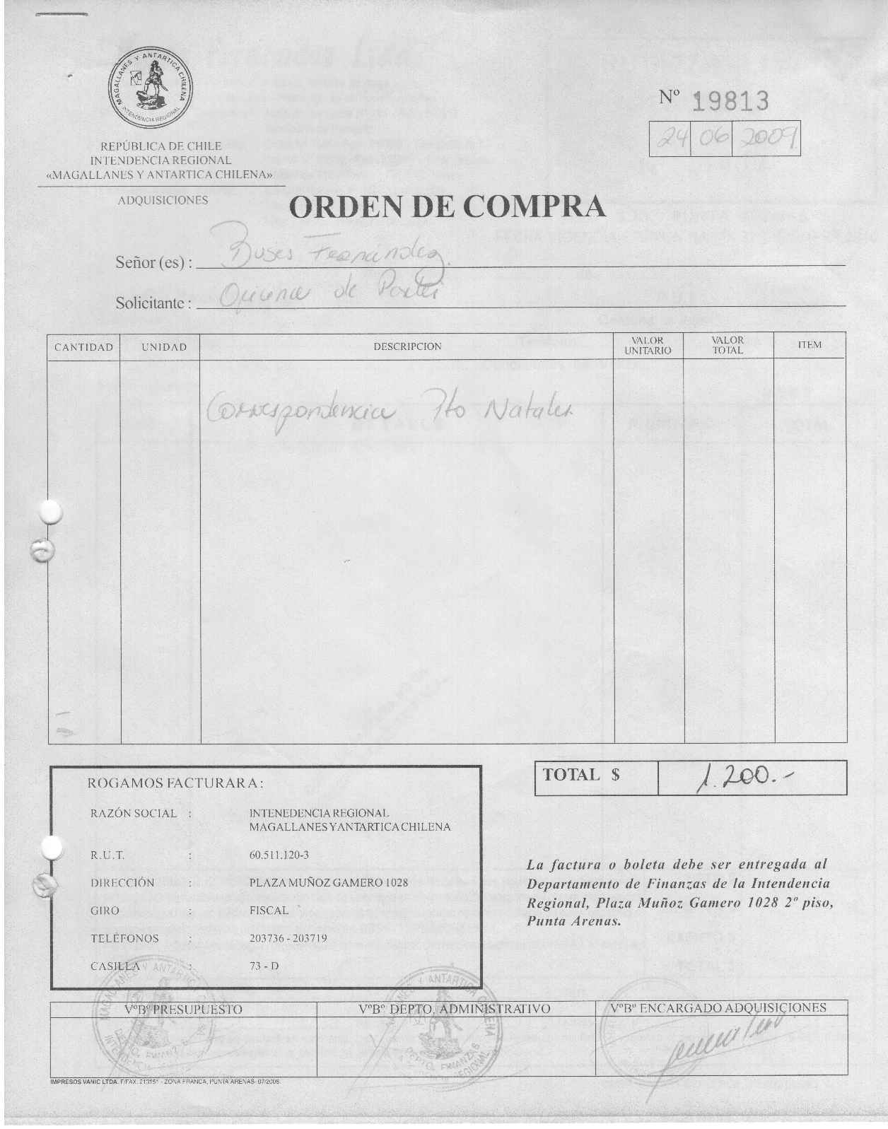 | 57 | 24/06/2009 | Orden de Compra N° 19813 | Correspondencia a Puerto Natales | 24/06/2009 | 24/06/2009 | Pesos | 1.200 | Buses Fernández | 77.492.710-7 | Ver enlace | - | null | ||||