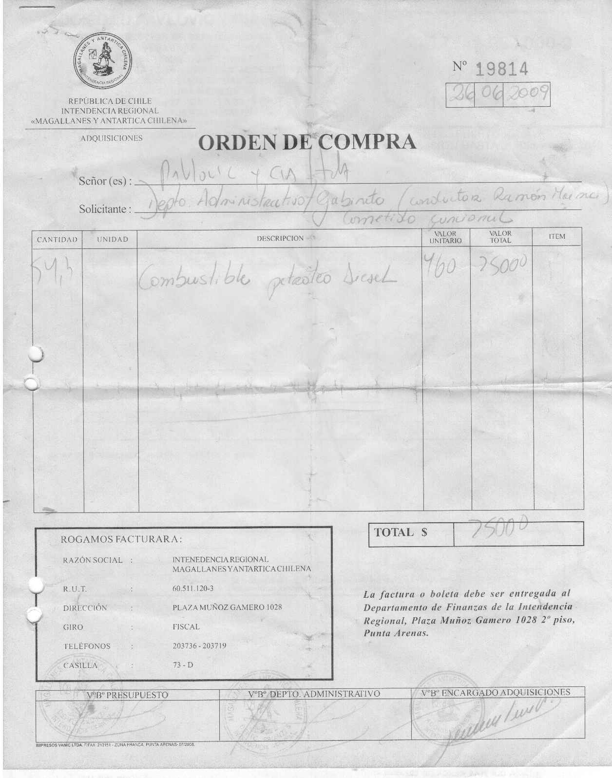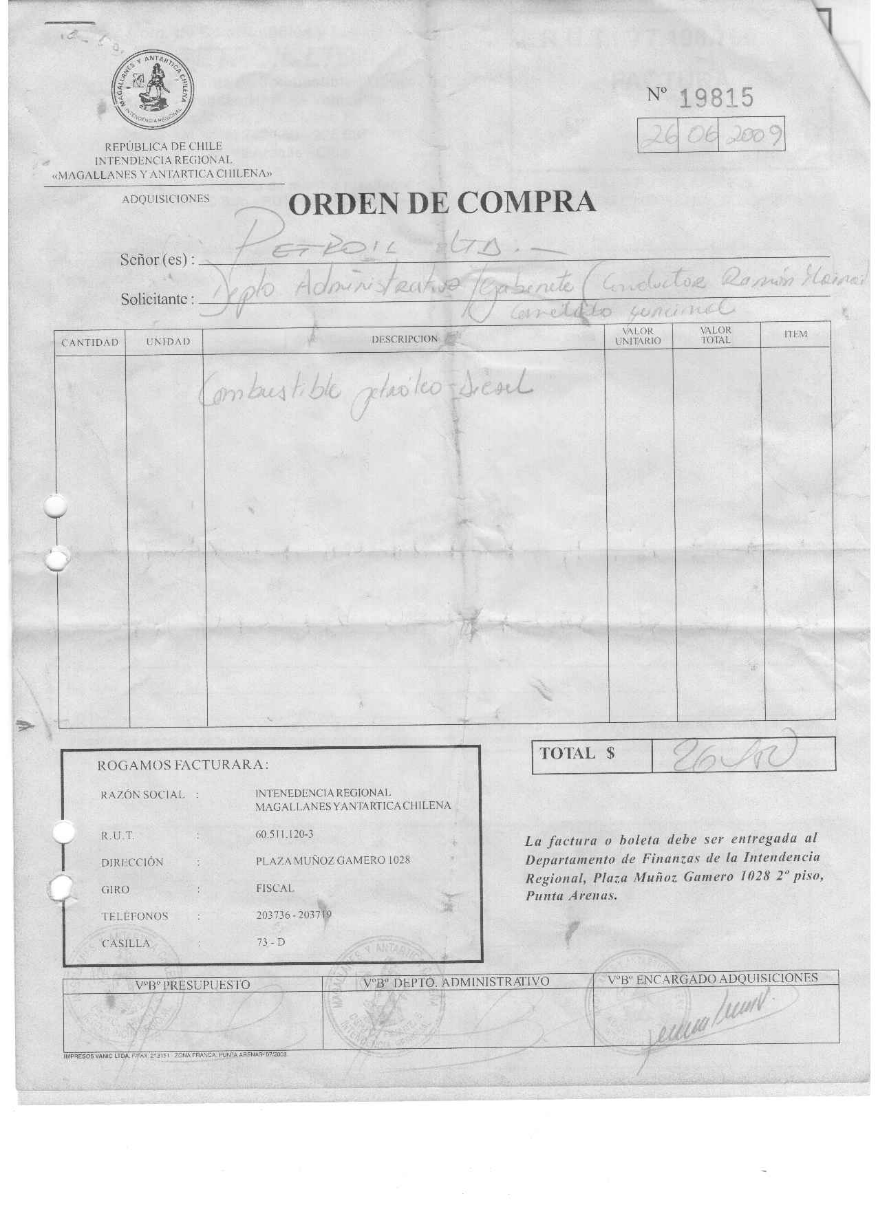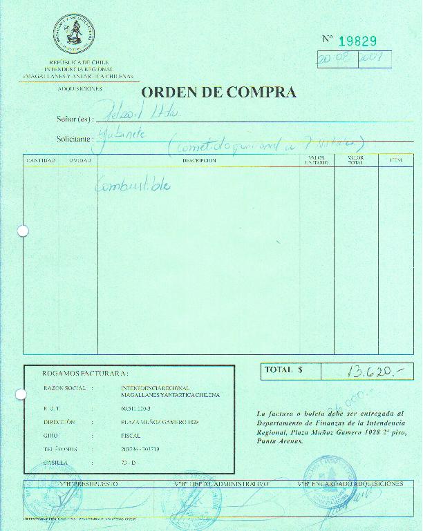 | 67 | 20/08/2009 | Orden de Compra N° 19829 | Combustible cometido funcional a P. Natales | 20/08/2009 | 20/08/2009 | Pesos | 13.620 | Petroil Ltda. | 77.196.790-6 | Ver enlace | - | null | ||||