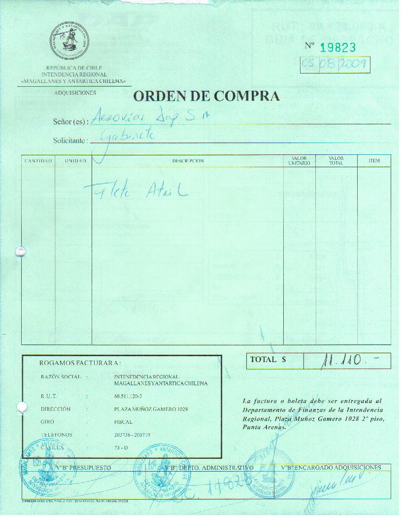 | 61 | 05/08/2009 | Orden de Compra N° 19823 | Flete Atril | 05/08/2009 | 05/08/2009 | Pesos | 11.110 | Aerovías Dap S.A. | 89.428.000-K | Ver enlace | - | null | ||||