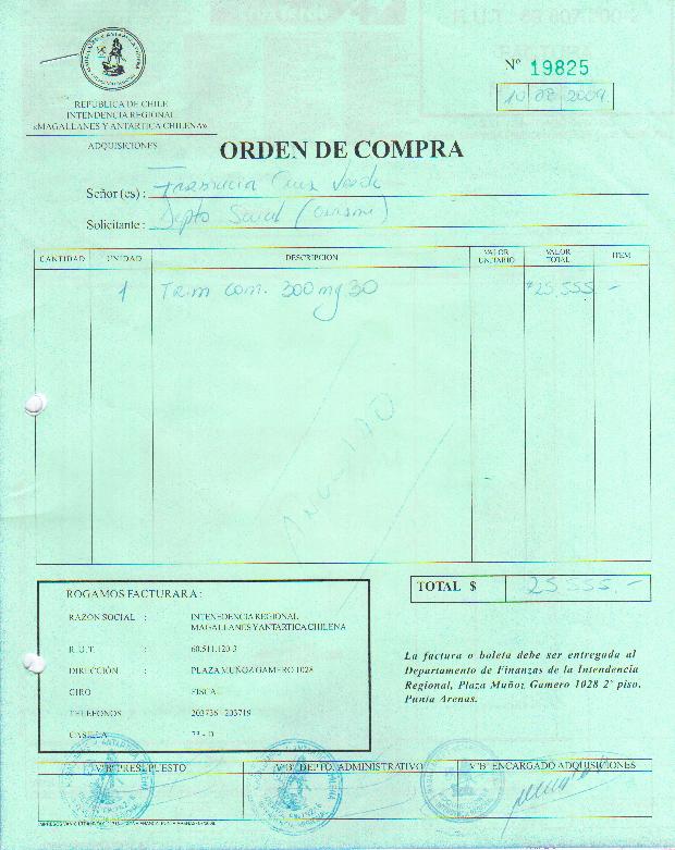 | 63 | 10/08/2009 | Orden de Compra N° 19825 | Orasmi - Medicamento ayuda social | 10/08/2009 | 10/08/2009 | Pesos | 25.555 | Farmacias Cruz Verde S.A | 89.807.200-2 | Ver enlace | - | null | ||||