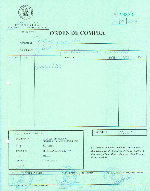 | 68 | 20/08/2009 | Orden de Compra N° 19830 | Combustible cometido funcional a P. Natales | 20/08/2009 | 20/08/2009 | Pesos | 26.000 | Soc. Pavlovic y Cía. Ltda. | 89.550-000-3 | Ver enlace | - | null | ||||
