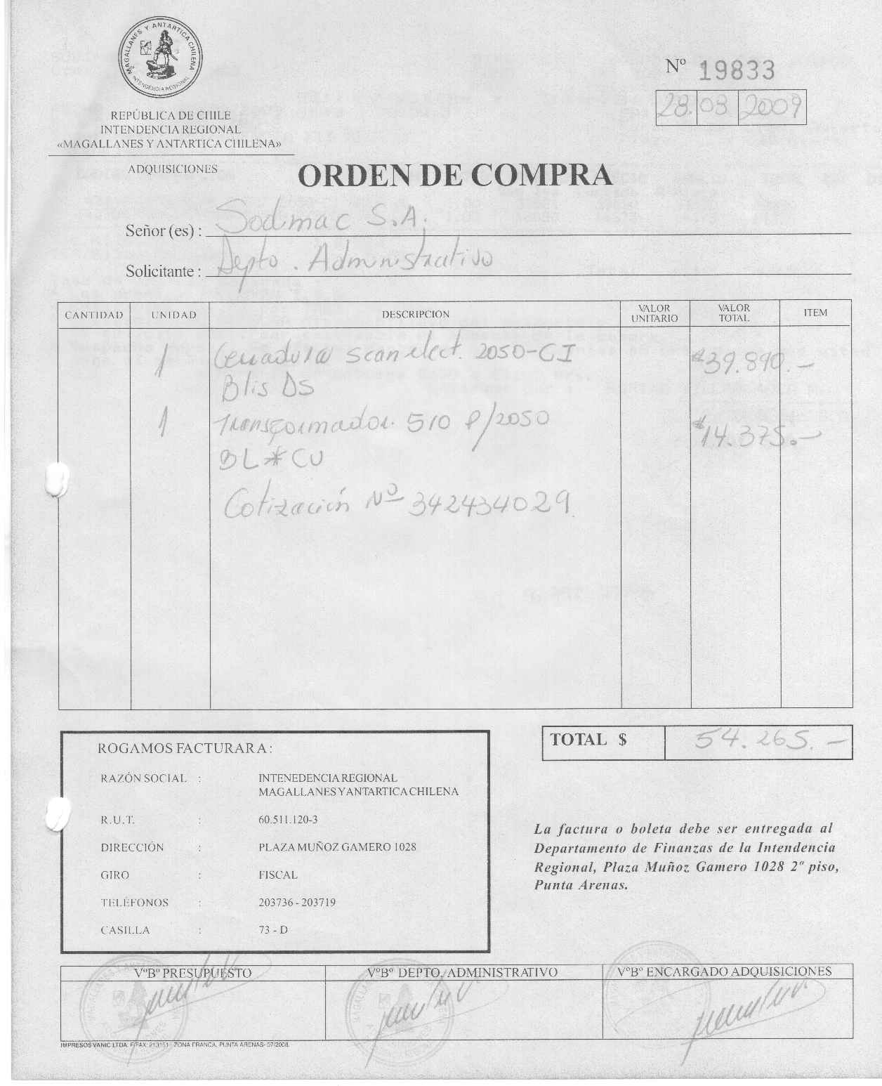 | 72 | 28/08/2009 | Orden de Compra N° 19833 | Dpto. Administrativo | 28/08/2009 | 28/08/2009 | Pesos | 54.265 | Sodimac S.A. | 96.792.430-K | Ver enlace | - | null | ||||
