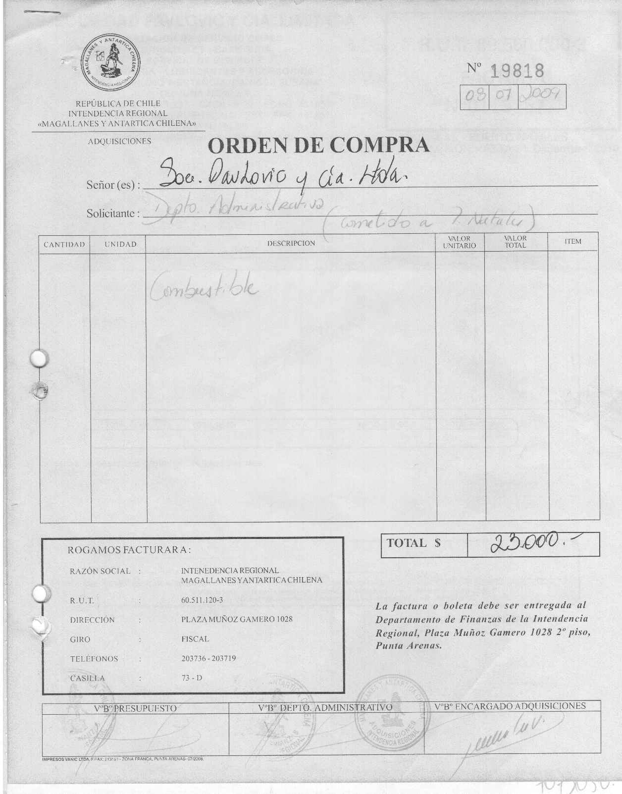 | 94 | 08/07/2009 | Orden de Compra N° 19818 | Combustible vehículos Cometido P.Natales | 08/07/2009 | 08/07/2009 | Pesos | 23.000 | Soc. Pavlovic y Cía. Ltda. | 89.550.000-3 | Ver enlace | - | null | ||||