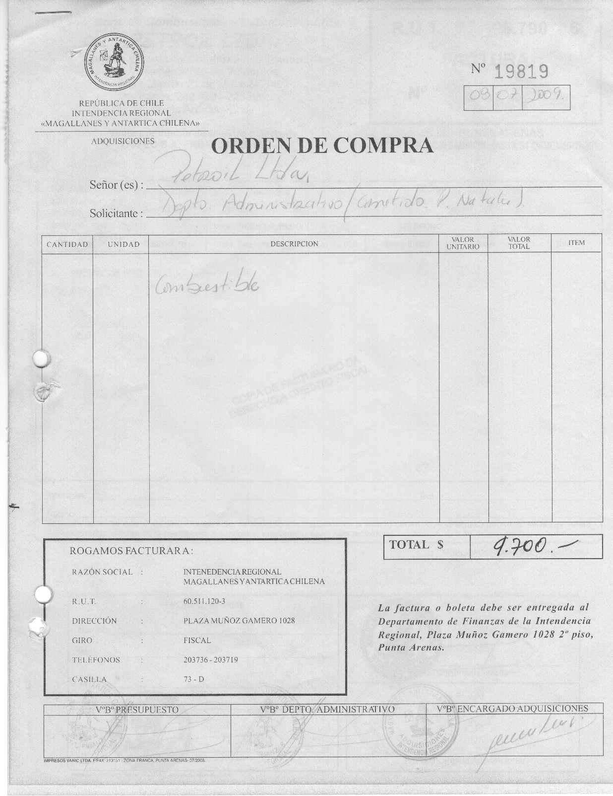 | 95 | 08/07/2009 | Orden de Compra N° 19819 | Combustible vehículos Cometido P.Natales | 08/07/2009 | 08/07/2009 | Pesos | 9.700 | Petroil Ltda. | 77.196.790-6 | Ver enlace | - | null | ||||