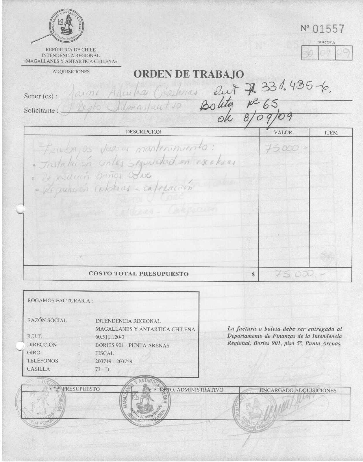 | 99 | 30/07/2009 | Orden de Trabajo N° 1557 | Trabajos de mantenimiento varios | 30/07/2009 | 30/07/2009 | Pesos | 75.000 | Jaime Aguilar Cárdenas | 7.331.435-6 | Ver enlace | - | null | ||||