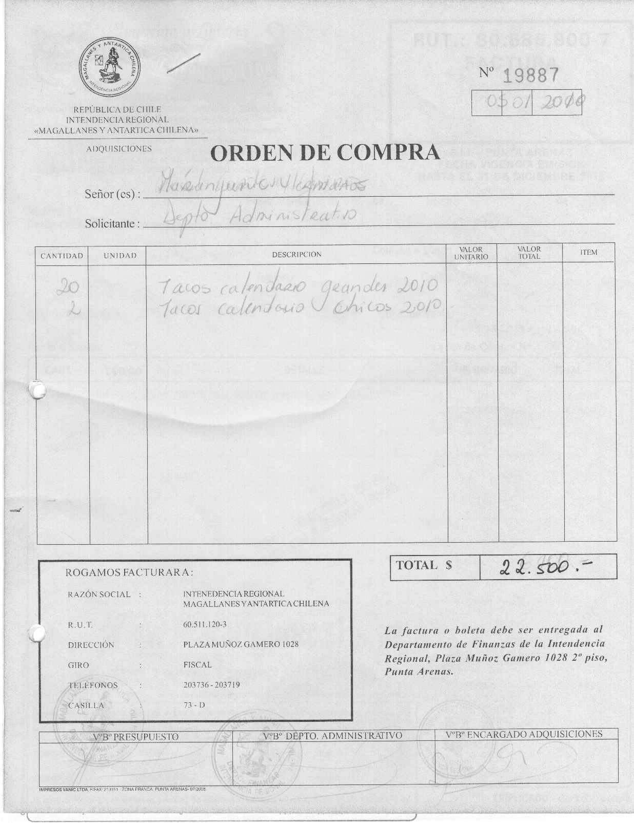 | 1 | 05/01/2010 | Orden de compra N° 19887 | Tacos calendarios grandes y chicos 2010 | 05/01/2010 | 05/01/2010 | pesos | 22.500 | Marangunic Hnos. | 80,586,800-7 | Ver enlace | ||||