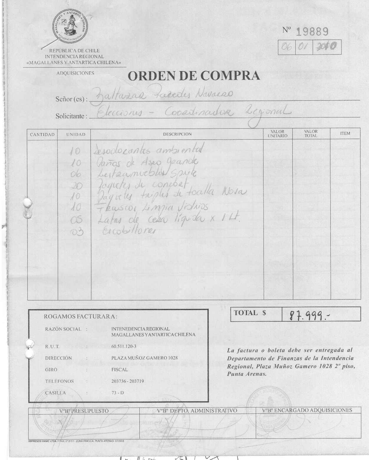 | 3 | 06/01/2010 | Orden de compra N° 19889 | Elecciones, articulos de aseo | 06/01/2010 | 06/01/2010 | pesos | 87.999 | Supermercado Balire | Paredes | navarro | Baltazar | 6,307,401-2 | Ver enlace | |