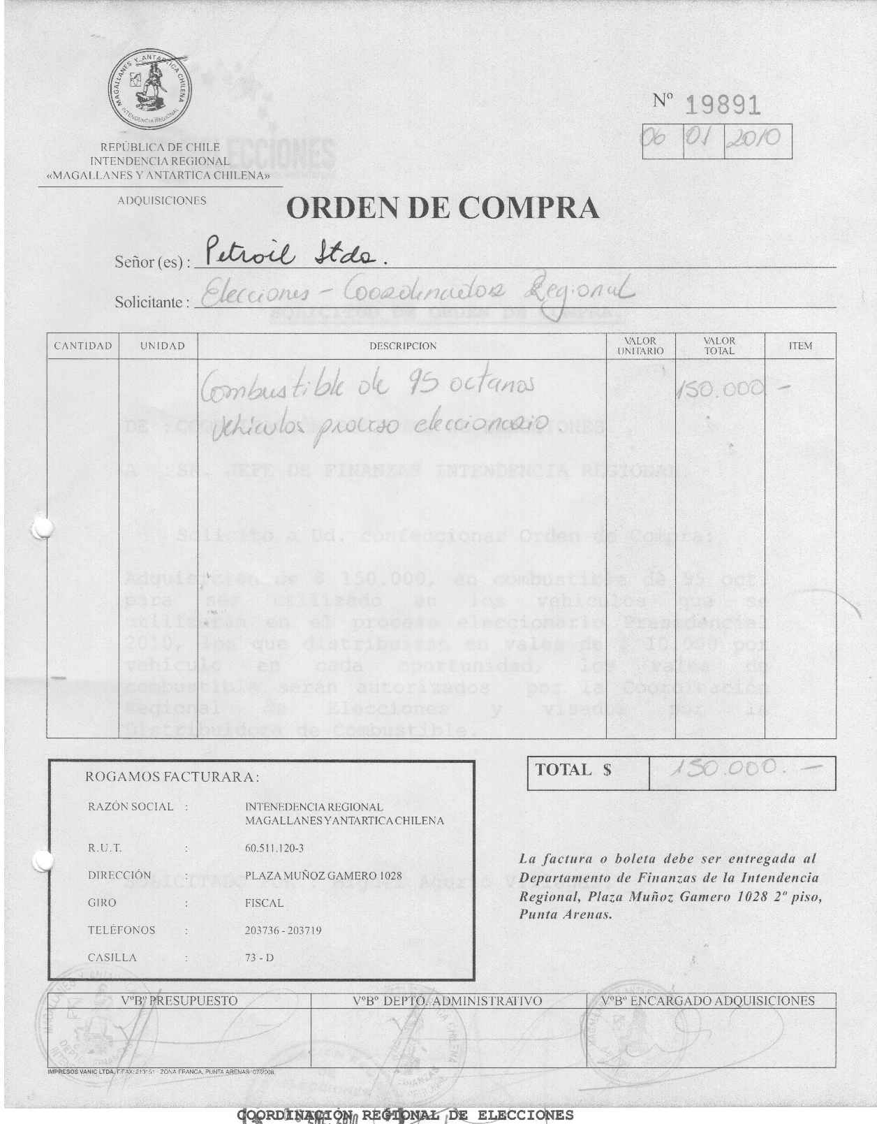 | 5 | 06/01/2010 | Orden de compra N° 19891 | Elecciones, combustible para vehículos | 06/01/2010 | 06/01/2010 | pesos | 150.000 | Petroil Ltda. | 77.196.790-6 | Ver enlace | ||||