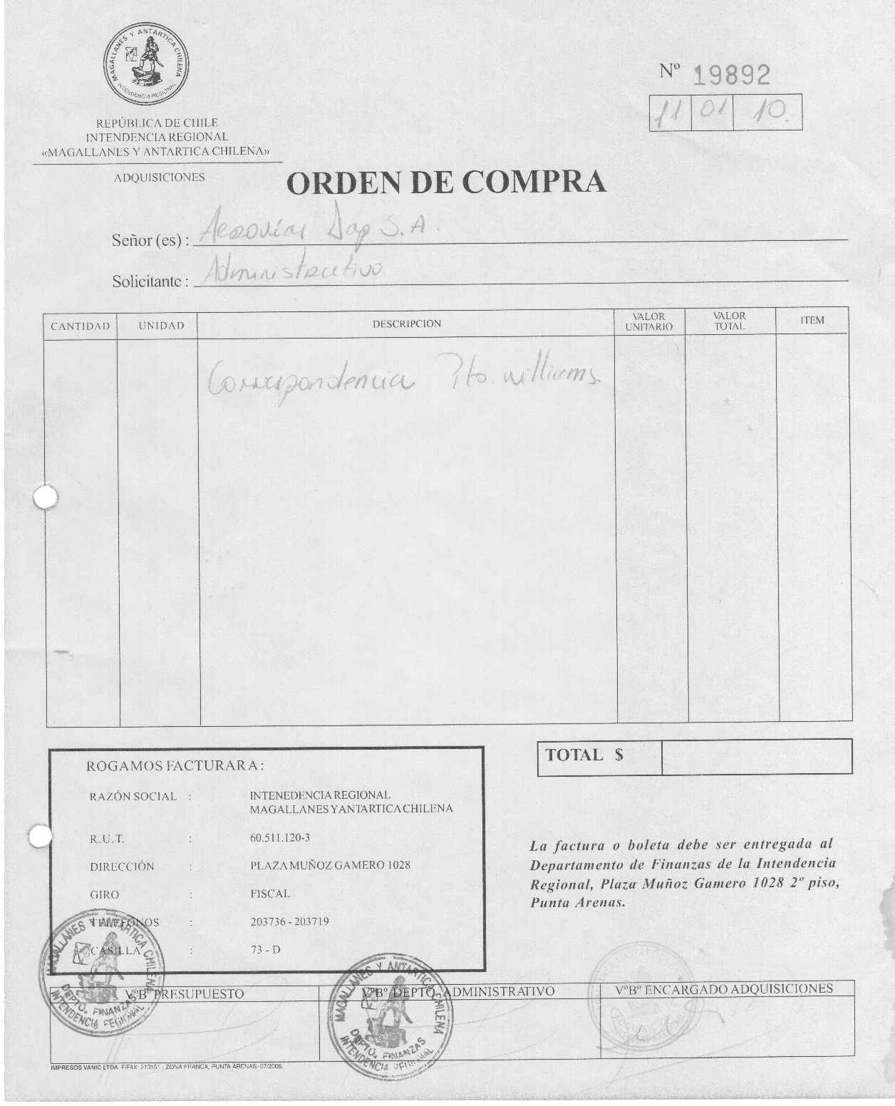 | 6 | 11/01/2010 | Orden de compra N° 19892 | correspondencia Puerto Williams | 11/01/2010 | 11/01/2010 | pesos | 5.800 | Aerovias Dap | 89,428,000-K | Ver enlace | ||||