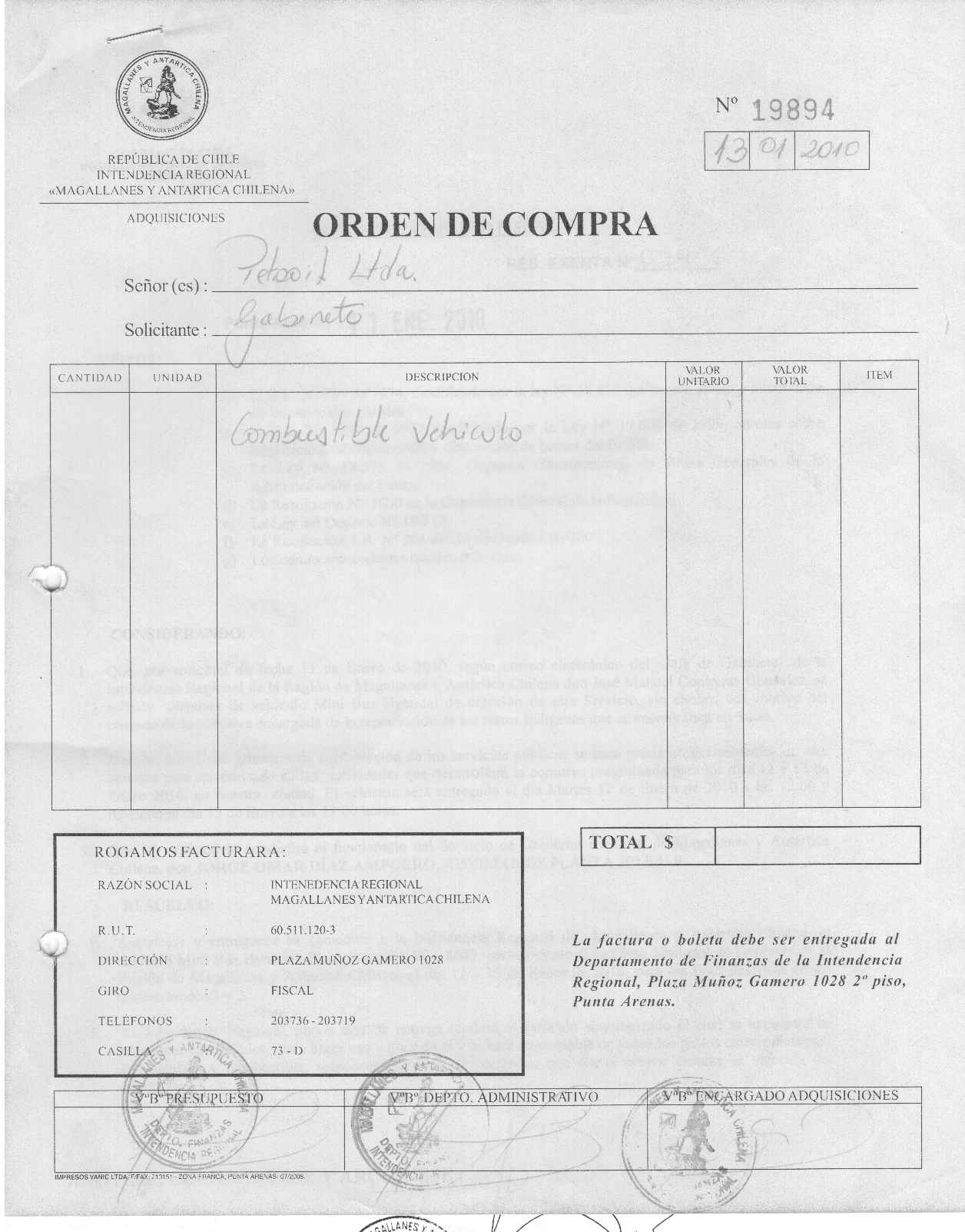 | 8 | 13/01/2010 | Orden de compra N° 19894 | Combustible vehículos comitiva repatriacion restos indigenas | 13/01/2010 | 13/01/2010 | pesos | 50.000 | Petroil Ltda. | 77.196.790-6 | Ver enlace | ||||