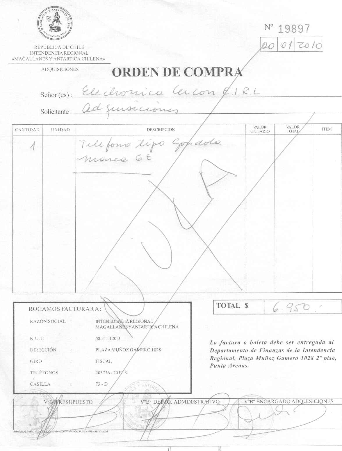 | 10 | 20/01/2010 | Orden de compra N° 19896 | un switch de 8 bocas | 20/01/2010 | 20/01/2010 | pesos | 13.950 | Cercon E.I.R.L. | Gonzalez | Paredes | Graciela | 79,949,000-5 | Ver enlace | |