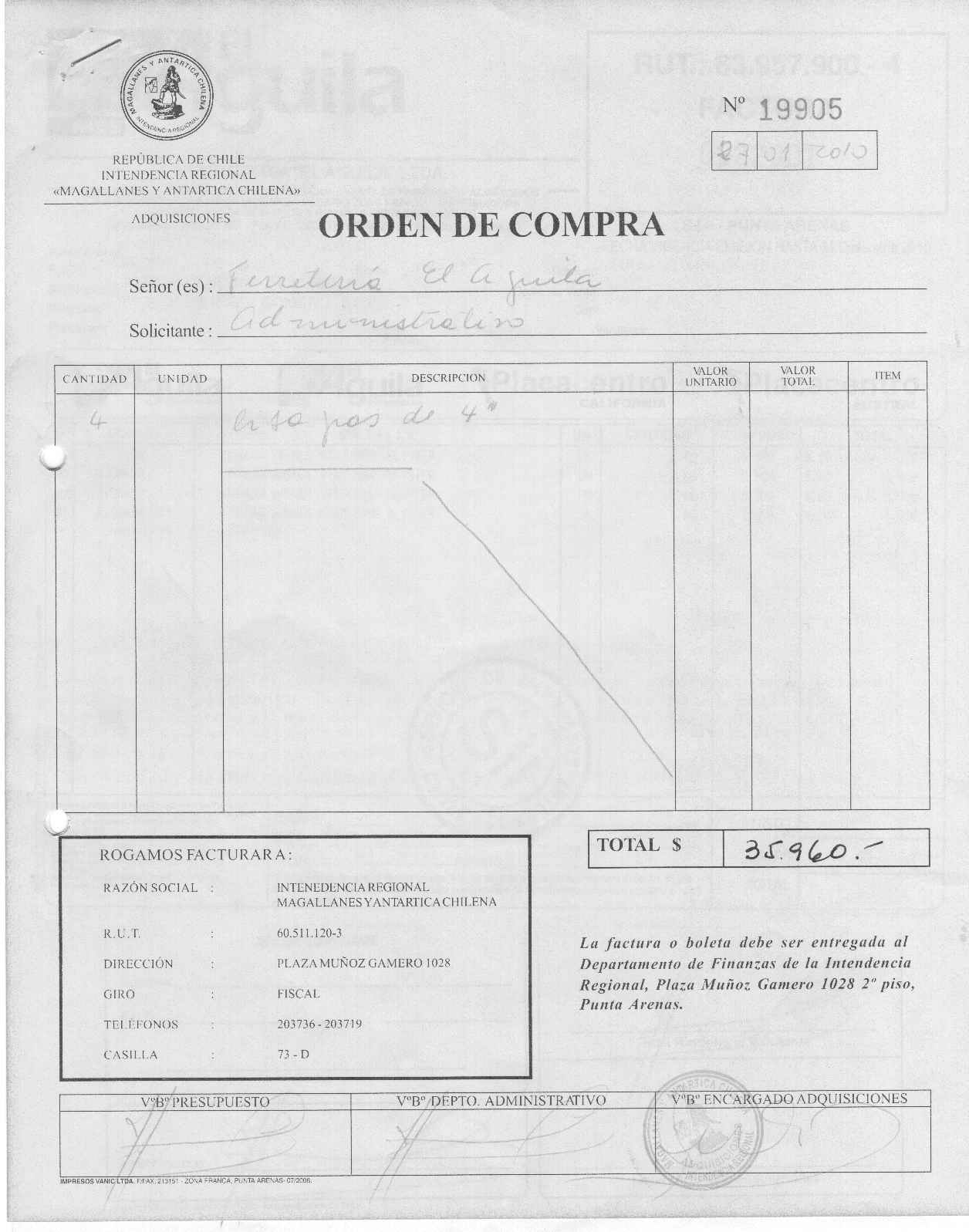 | 19 | 27/01/2010 | Orden de compra N° 19905 | bisagras porton Bodega P.Montt | 27/01/2010 | 27/01/2010 | pesos | 35.960 | Ferreteria El Aguila | 83,957,900-4 | Ver enlace |