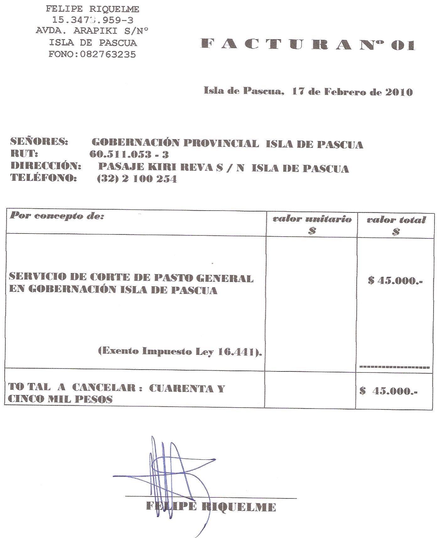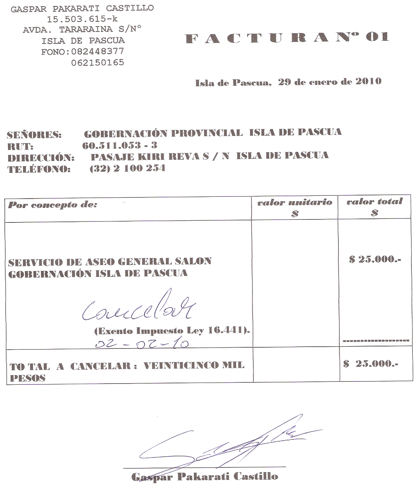 | 1 | 29/01/2010 | Egreso N°015 | Servicio de aseo sala de reuniones | 02/02/2010 | 02/02/2010 | pesos | 25.000 | Castillo | Pakarati | Gaspar | 15.503.615-k | Ver enlace | ||