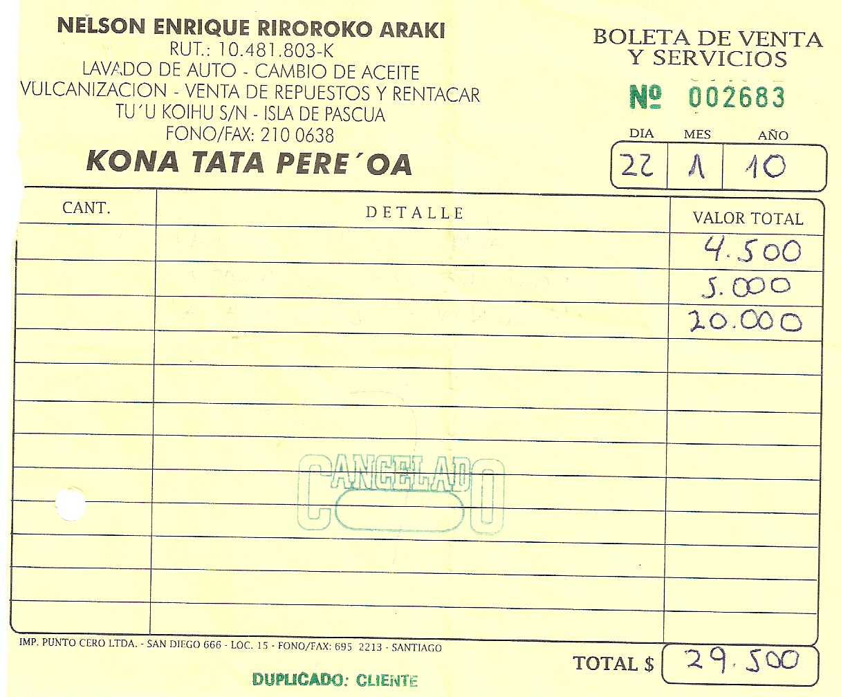 | 5 | 21/01/2010 | Egreso N° 025 | Mantención de Vehiculo | 10/02/2010 | 10/02/2010 | pesos | 29.500 | Araki | Riroroko | Nelson | 10.481.803-k | Ver enlace | ||