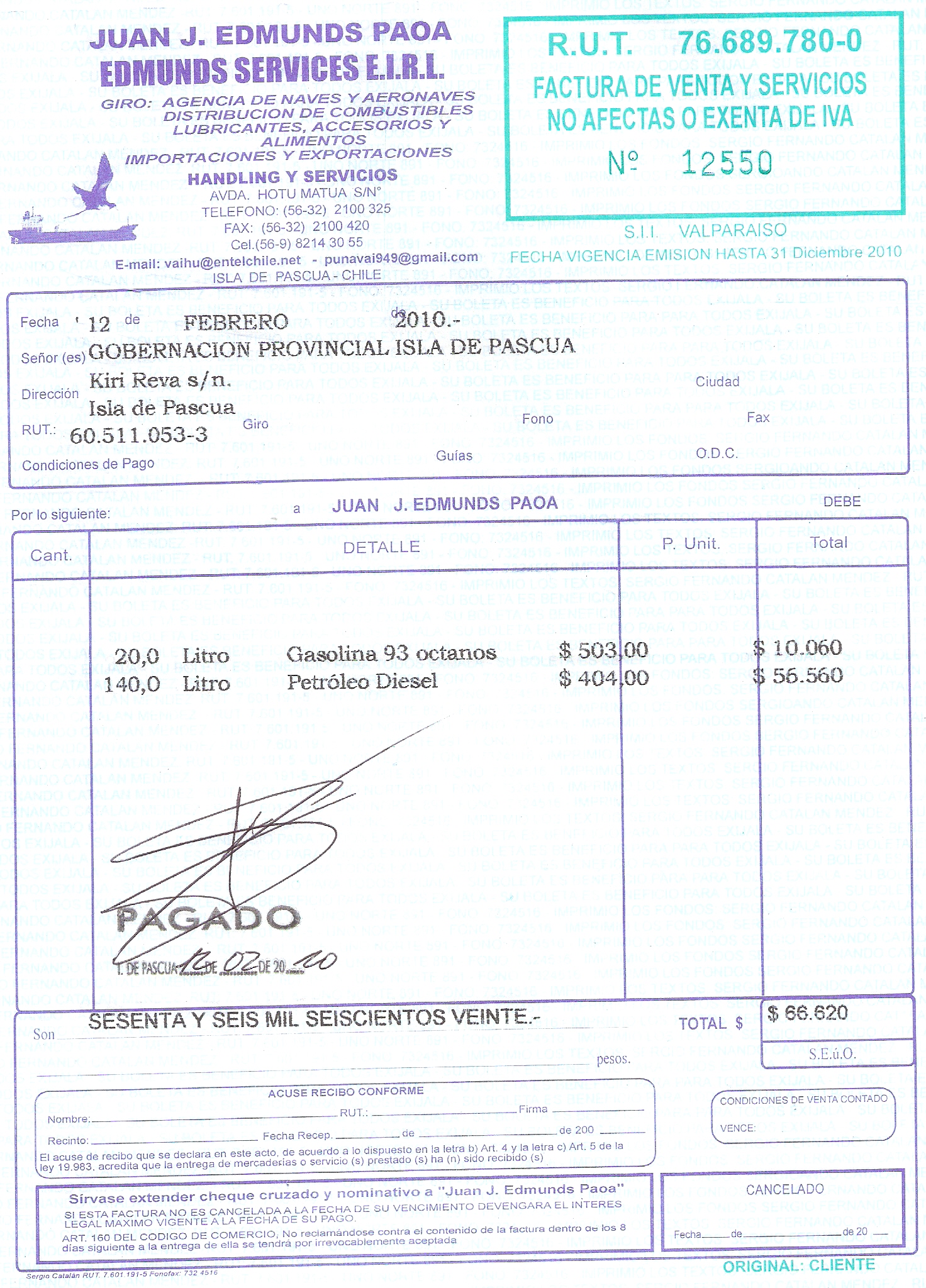 | 7 | 12/02/2010 | Egreso N° 027 | Consumo Combustible | 12/02/2010 | 12/02/2010 | pesos | 66.620 | Edmunds | Paoa | Juan | 10.084.113-1 | Ver enlace | ||