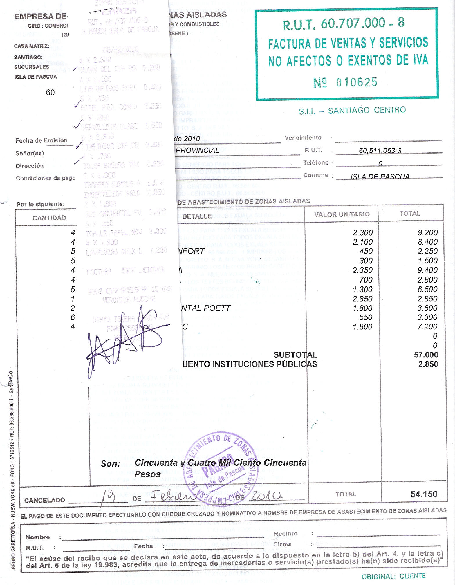 | 9 | 08/02/2010 | Egreso N° 33 | Materiales y útiles de aseo | 18/02/2010 | 18/02/2010 | pesos | 54.150 | Emaza isla de pascua | 60.707.000-8 | Ver enlace |