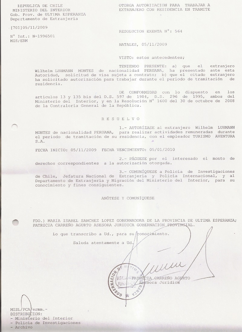 AUTORIA PARA TRABAJAR CON VISA EN TRAMITE A CIUDADANO PERUANO, WILHELM LUHMANN |